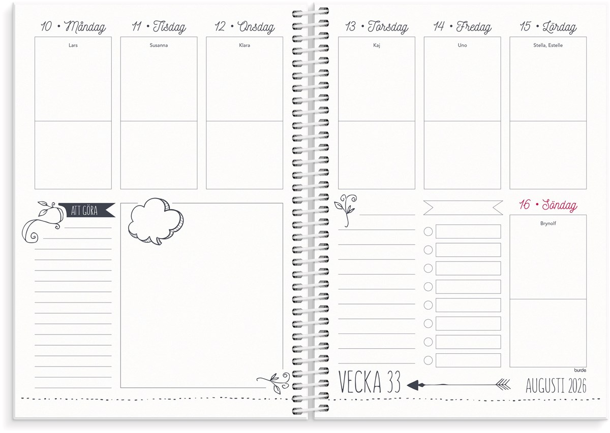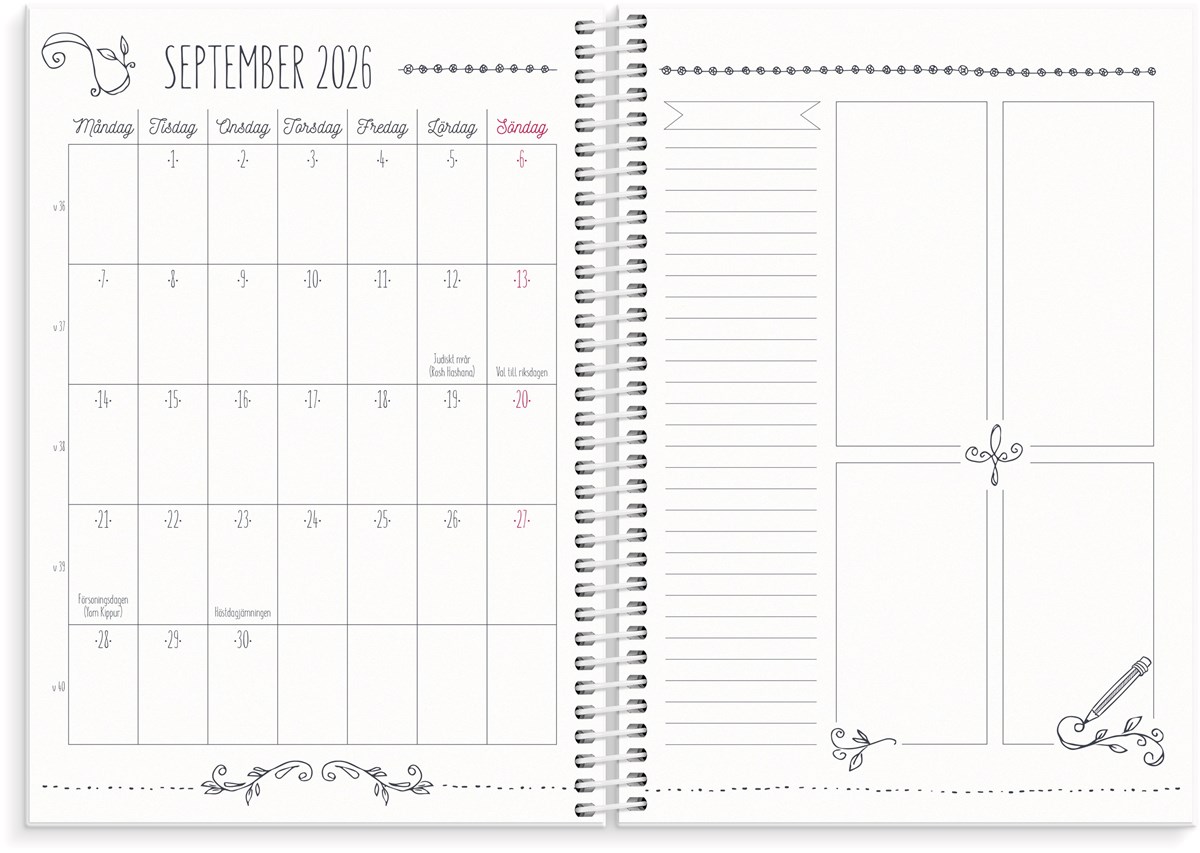 Format: A5. Mått: 160 x 215 x 16 mm. Layout: Vecka/uppslag. Rutor. Kalendarium: 2026-06-15 - 2027-07-18. Omslag: Kartong med sammetslen yta. Spiralbunden. Detaljer: Gummiband. Flyttbar plastlinjal. Pappersficka. Innehåll: Flaggdagar, helgdagar/aftnar, månadsöversikt, namnsdagar, temadagar/händelser, årsöversikt/årsöversikter, årsplan/årsplaner, målarsidor, anteckningssidor, stickersark. Antal sidor: 160. Miljöinformation: FSC®.