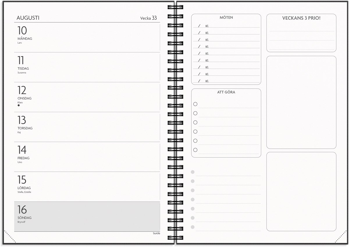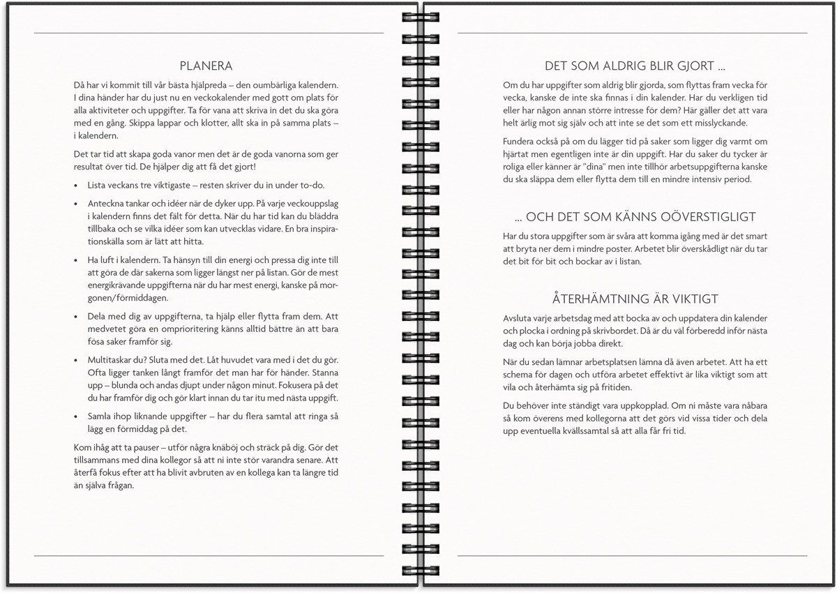 Få det Gjort är en smakfull kalender med bra möjlighet att komplettera dina redan existerande tekniska lösningar. En kombination av analog och digital planering är ett vinnande koncept för din vardags- och jobbplanering! A5 kalendern har veckouppslag med hela veckan i en horisontell layout på vänster sida och till höger finner du olika listor för inköp, prioriteringar och möten. Lägg till ett stilfullt omslag eller uppskatta den stilrena svart/vita designen precis som den är.