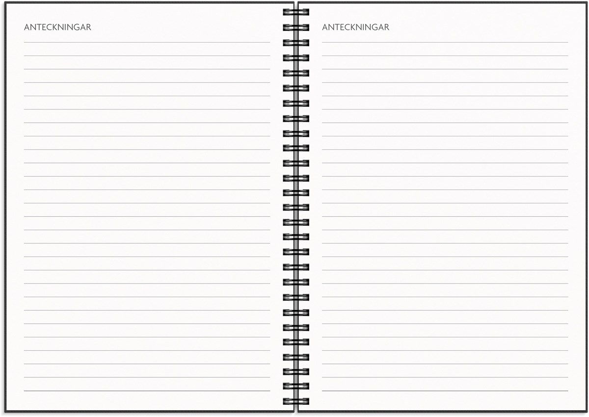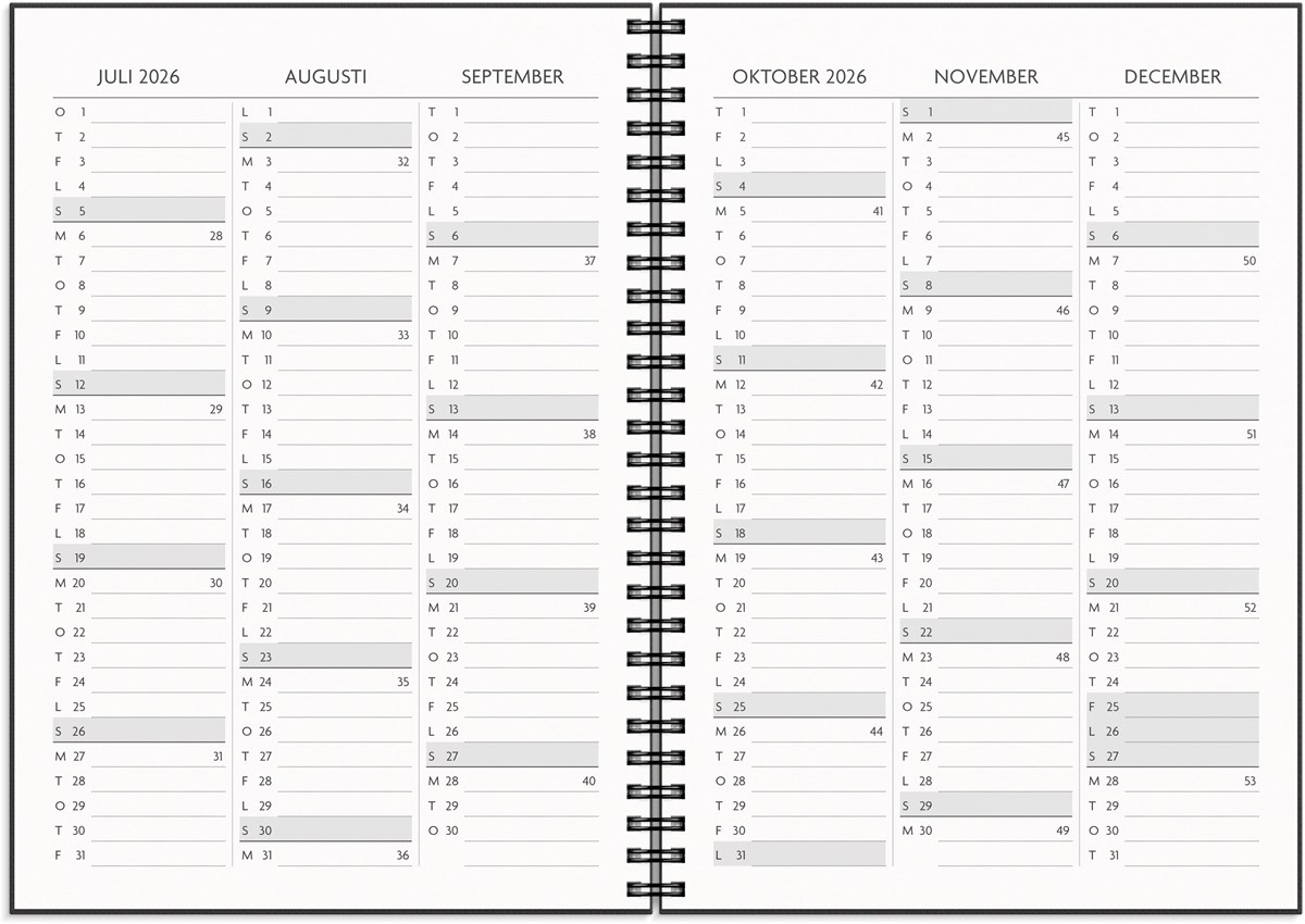 Format: A5. Mått: 160 x 220 x 15 mm. Layout: Vecka/uppslag. Liggande. Kalendarium: 2026-06-08 - 2027-06-27. Omslag: Kartong med struktur. Spiralbunden. Detaljer: Gummiband. Pappersficka. Innehåll: Flaggdagar, helgdagar/aftnar, månfaser, namnsdagar, internationella helgdagar översikt, temadagar/händelser, årsplan/årsplaner, anteckningssidor linjerade. Antal sidor: 144. Miljöinformation: FSC®.