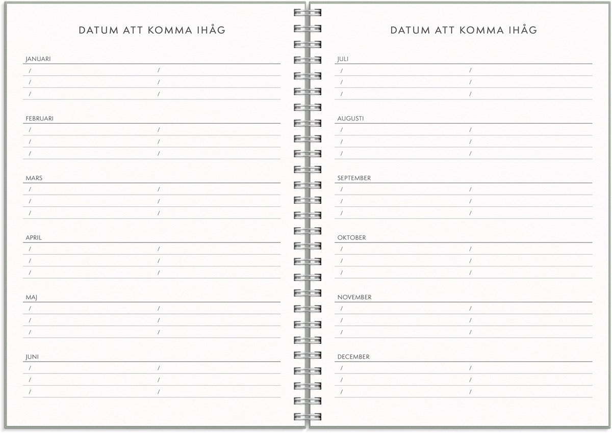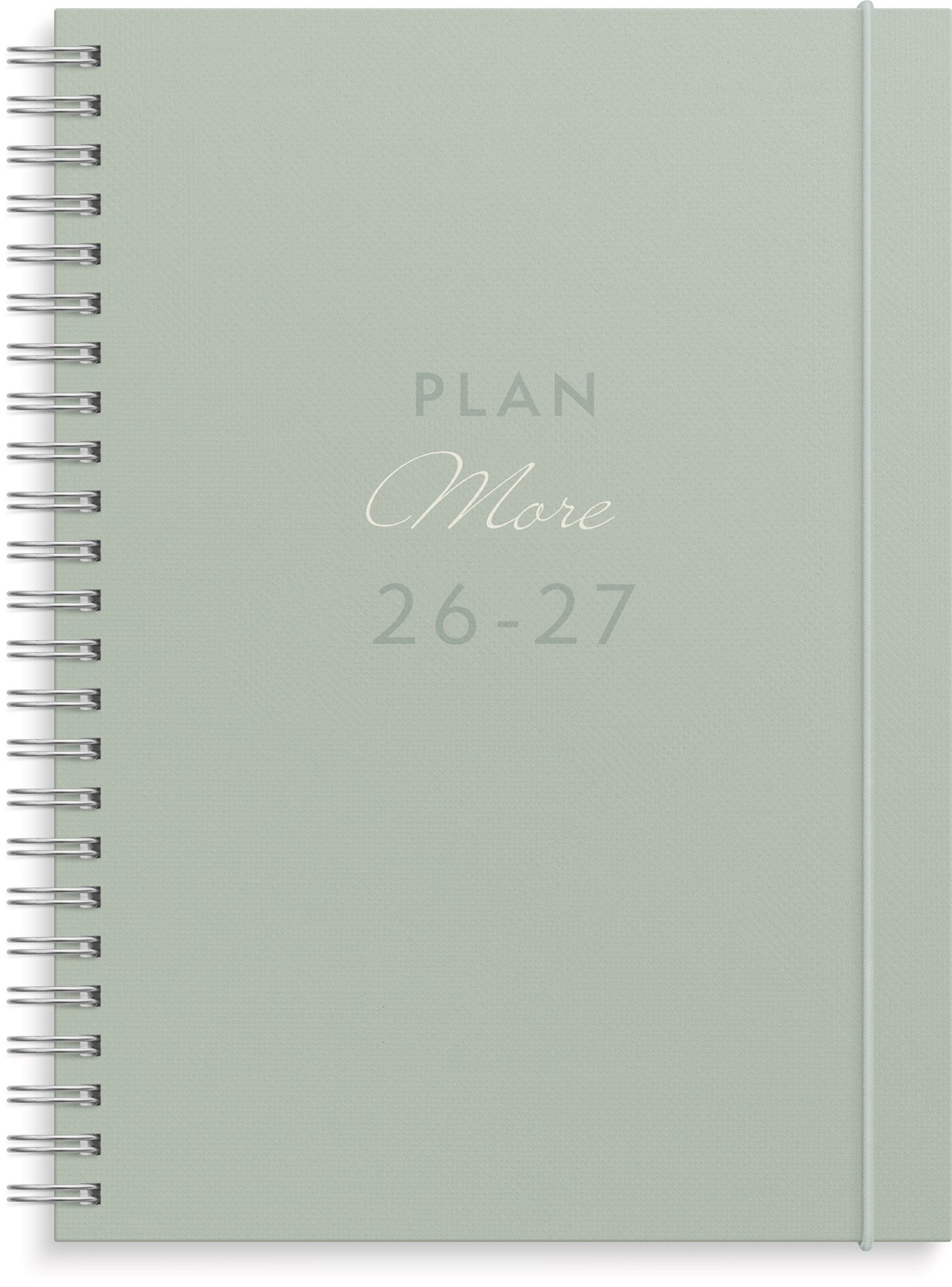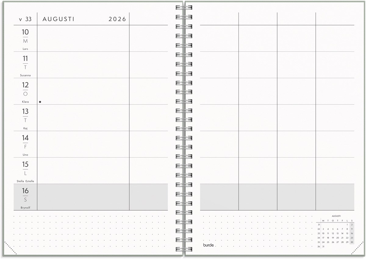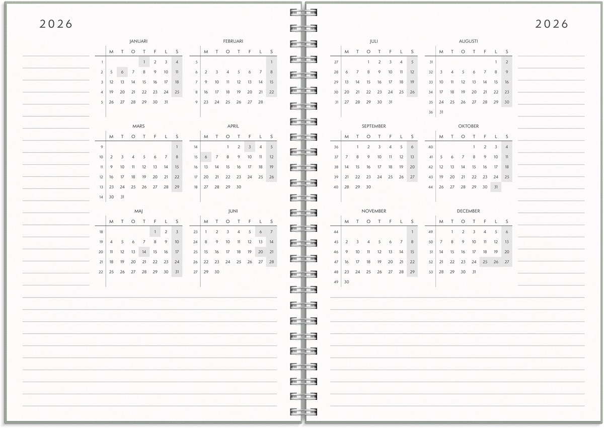 Format: A5. Mått: 160 x 17 x 218 mm. Layout: Vecka/uppslag. Liggande. Kalendarium: 2026-06-29 - 2027-07-25. Omslag: Kartong med struktur. Spiralbunden. Detaljer: Gummiband. Pappersficka. Innehåll: Flaggdagar, helgdagar/aftnar, månfaser, namnsdagar, temadagar/händelser, årsöversikt/årsöversikter, årsplan/årsplaner, anteckningssidor linjerade, anteckningssidor olinjerade, månadens kom-ihåg. Antal sidor: 160. Miljöinformation: FSC®.