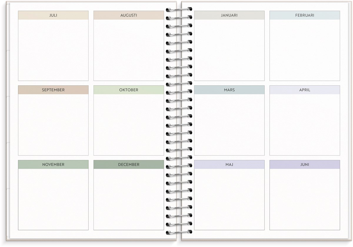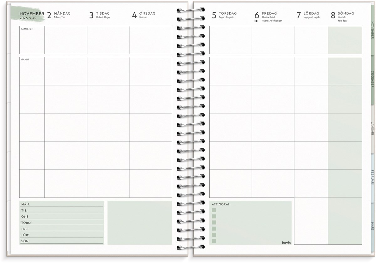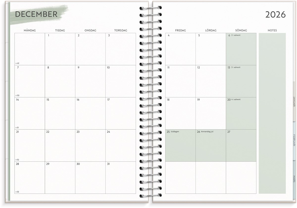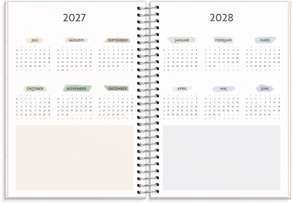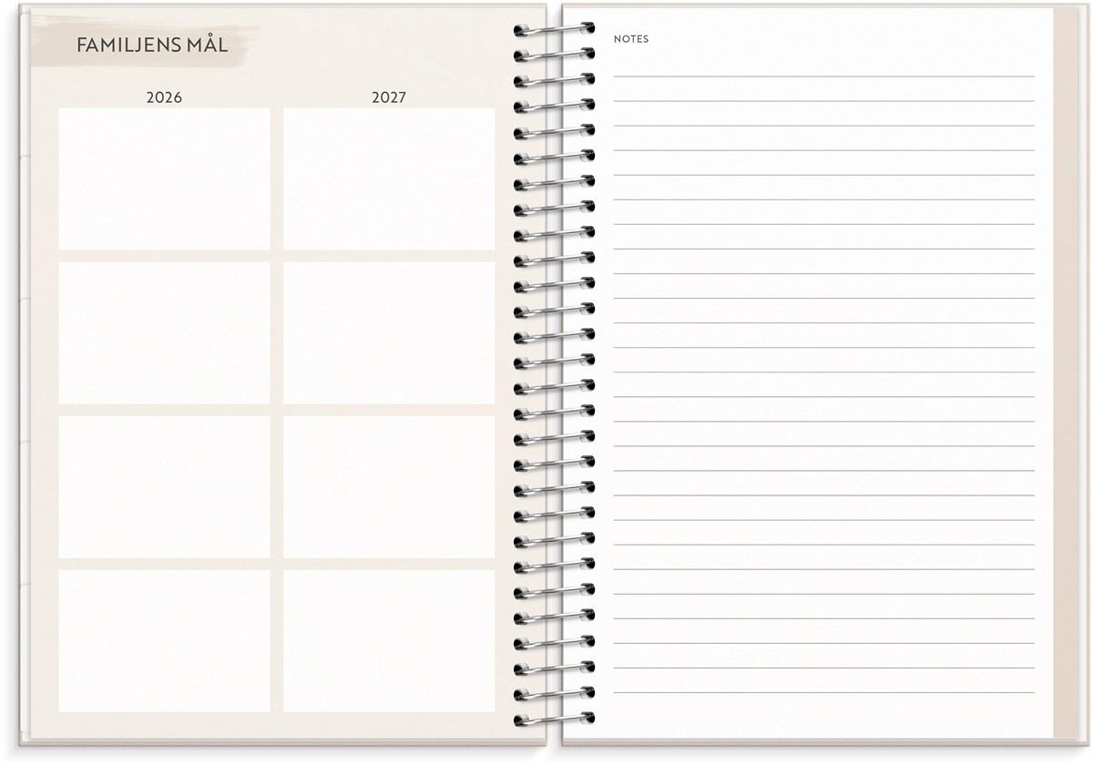 Format: A5. Mått: 175 x 216 x 26 mm. Layout: Vecka/uppslag. Stående. Kalendarium: 2026-06-22 - 2027-06-27. Omslag: Kartong med struktur. Spiralbunden. Detaljer: Pappersficka. Innehåll: Flaggdagar, helgdagar/aftnar, månadsöversikt, månfaser, namnsdagar, temadagar/händelser, årsöversikt/årsöversikter, årsplan/årsplaner, checklistor, familjens mål, månadens mål, anteckningssidor, stickersark, to-do, trackers. Antal sidor: 176. Miljöinformation: FSC®.