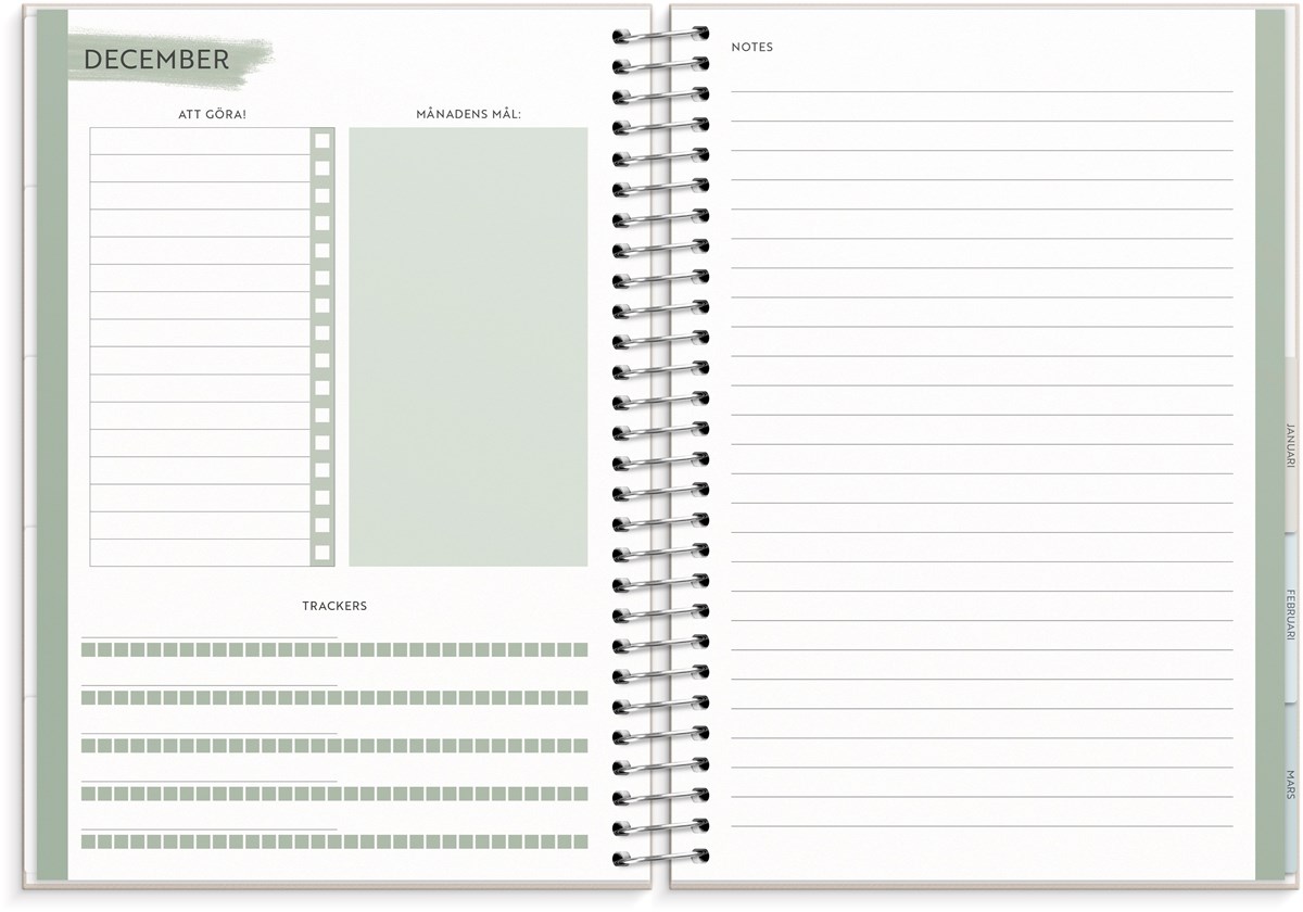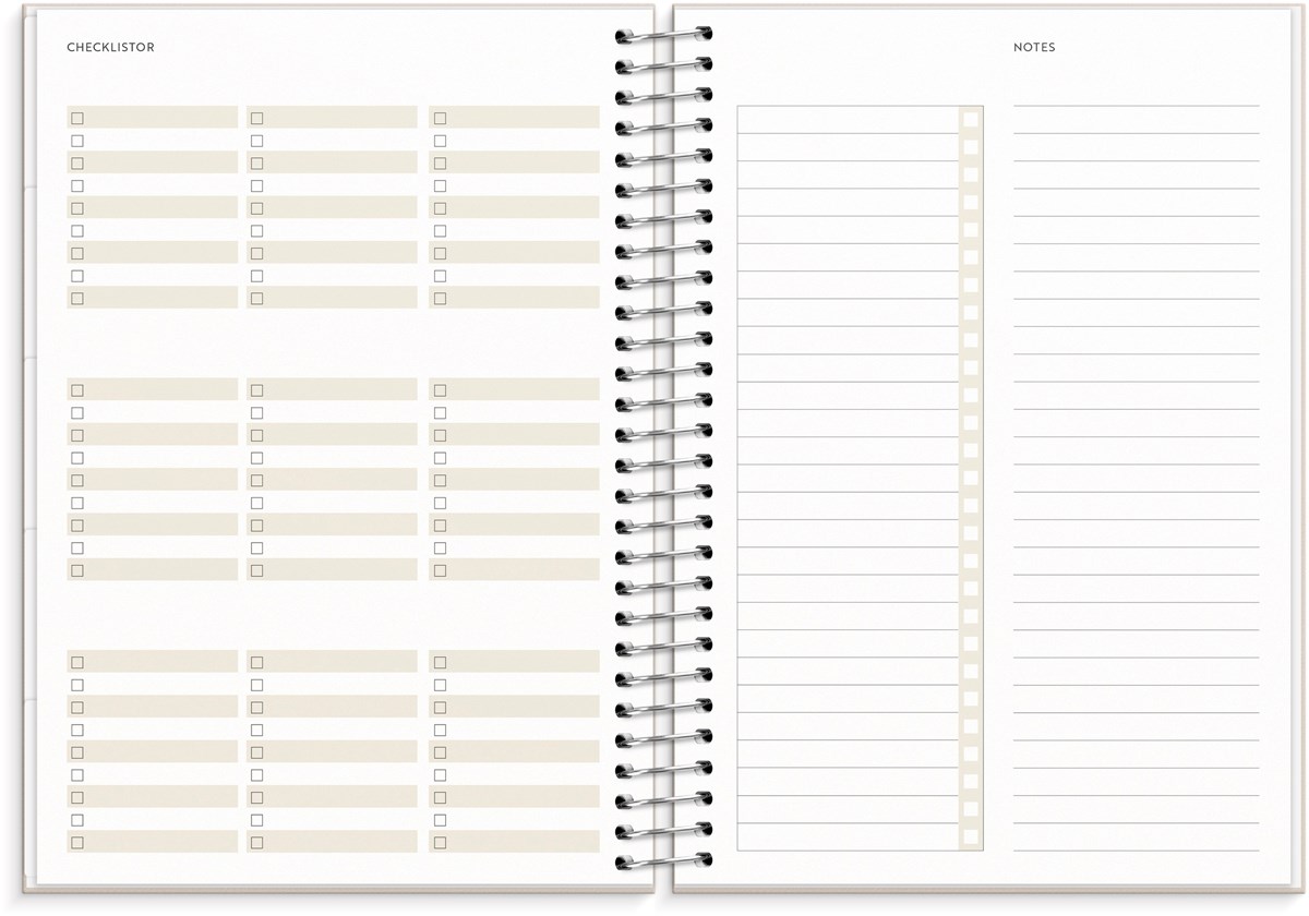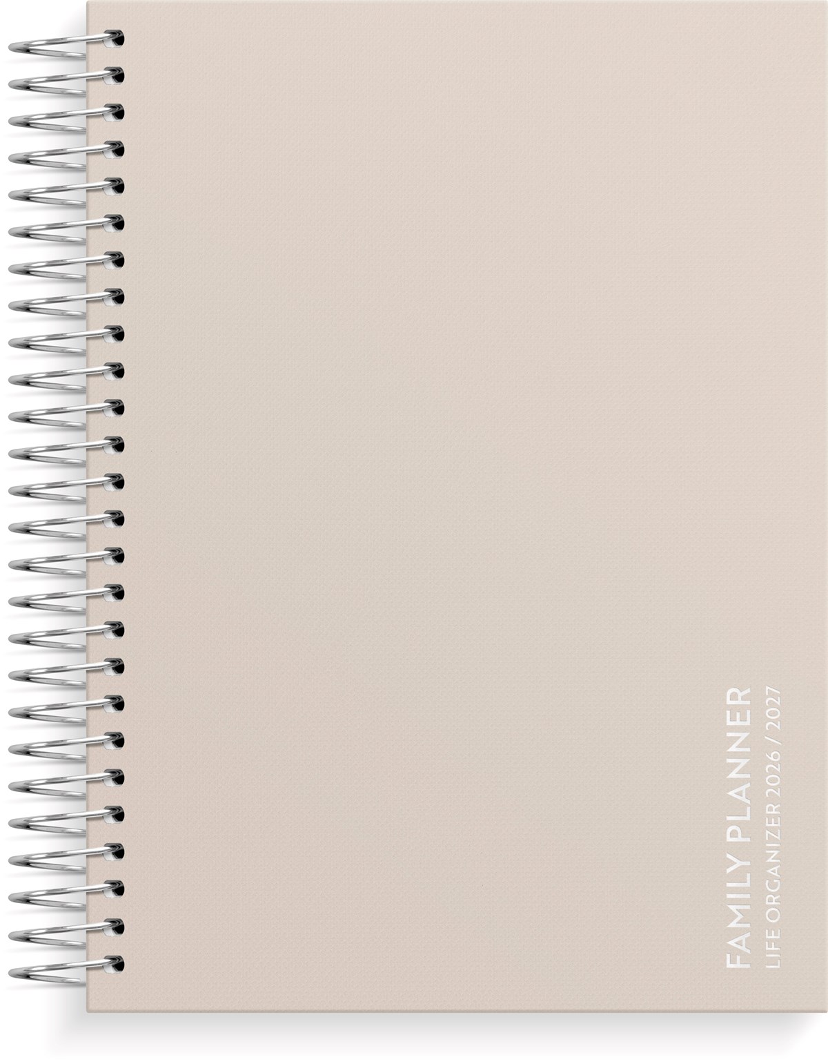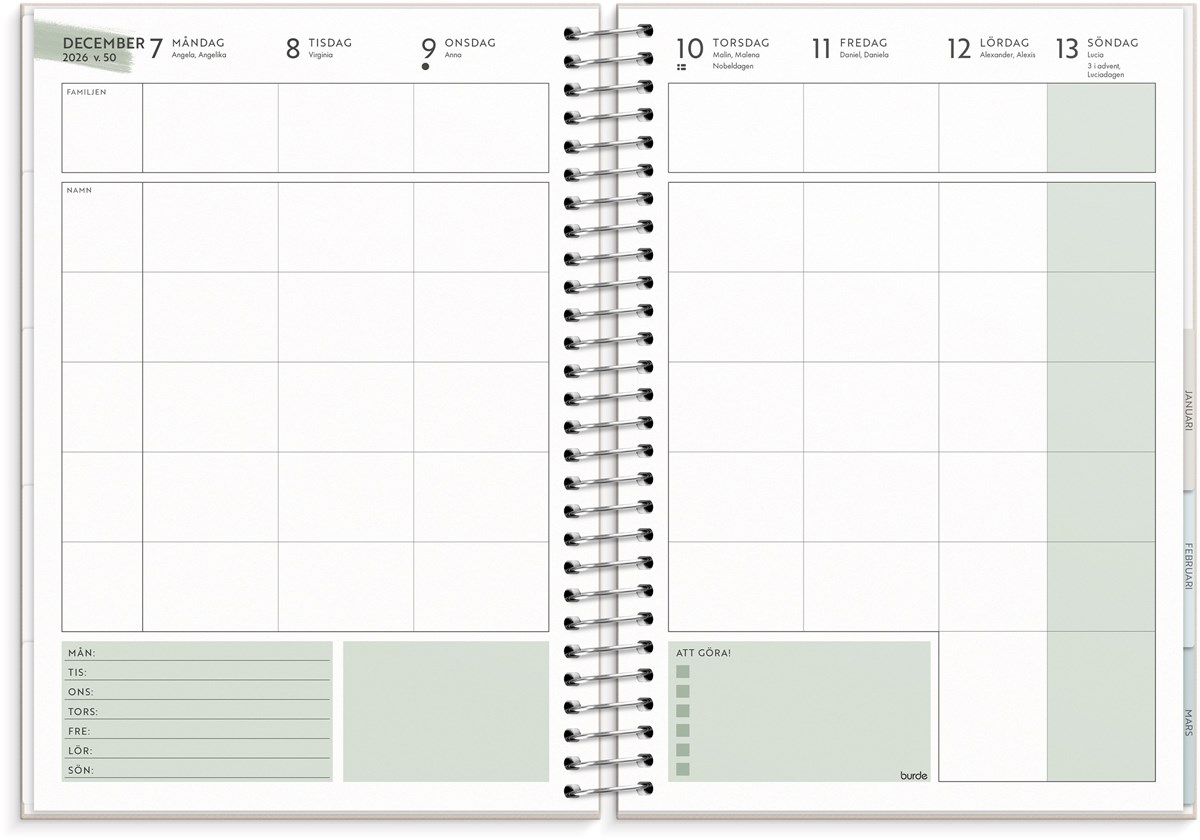 Format: A5. Mått: 175 x 216 x 26 mm. Layout: Vecka/uppslag. Stående. Kalendarium: 2026-06-22 - 2027-06-27. Omslag: Kartong med struktur. Spiralbunden. Detaljer: Pappersficka. Innehåll: Flaggdagar, helgdagar/aftnar, månadsöversikt, månfaser, namnsdagar, temadagar/händelser, årsöversikt/årsöversikter, årsplan/årsplaner, checklistor, familjens mål, månadens mål, anteckningssidor, stickersark, to-do, trackers. Antal sidor: 176. Miljöinformation: FSC®.