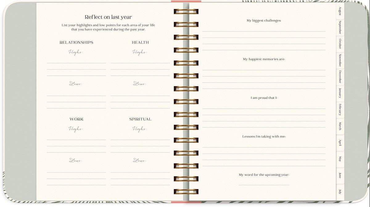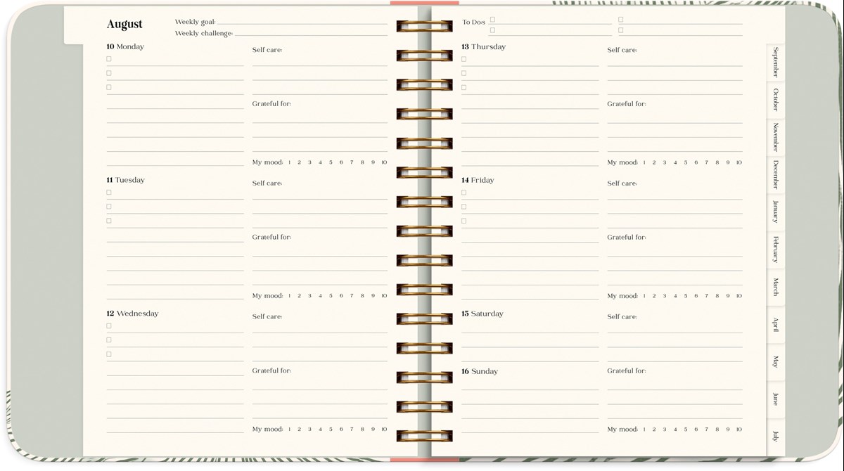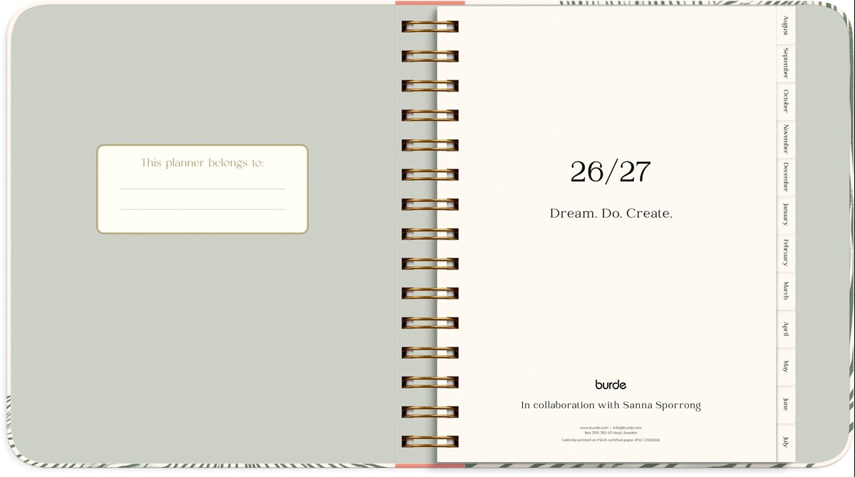 Kalendern innehåller inledande teorisidor med plats för reflektion kring ditt mående, hur du kan hitta ditt syfte i livet, visualisera och manifestera dina drömmar, och nå dina mål. Sedan följer årsplanering, månadsuppslag och veckouppslag med plats för din planering, mål, utmaningar, self care- och tacksamhetsnotering, humörnotering 1-10 och habit trackers. Efter varje månad finns ett uppslag med reflekterande frågor för att följa upp månaden som gått, och sätta intentioner och planera inför kommande månad. Kalendern kommer i en helt ny, exklusiv bindning med hårdpärm och gömd spiral. Tre ark med färgglada klistermärken att dekorera med ingår. Mått: 216 x 190 x 35 mm. Layout: Vecka/uppslag. Liggande. Kalendarium: 2026-07-27 - 2027-08-29. Omslag: Kartong med sammetslen yta. Spiralbunden. Detaljer: Gummiband. Innehåll: Språk engelska, internationella helgdagar översikt, årsöversikt/årsöversikter, årsplan/årsplaner, mål, habit tracker, reflektioner, stickersark. Antal sidor: 224. Miljöinformation: FSC®.