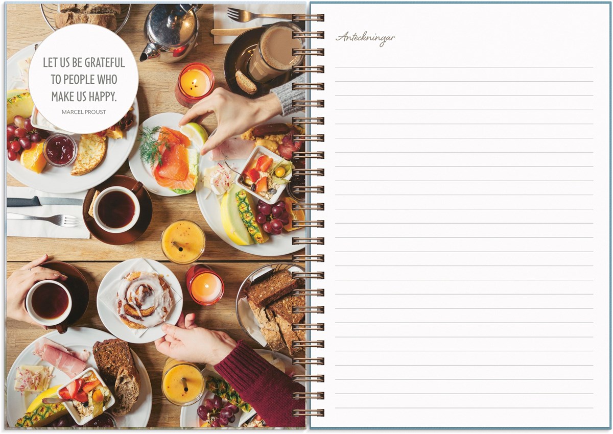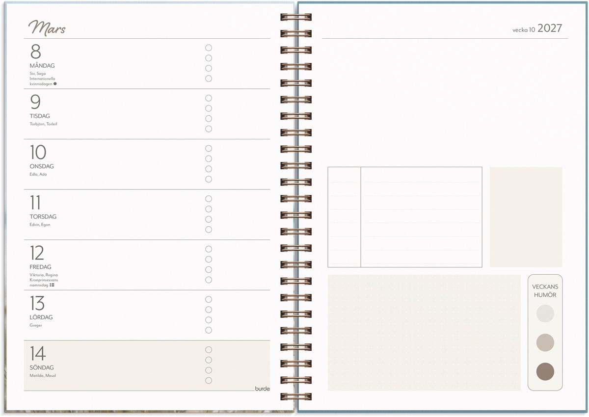 Format: A5. Mått: 17 x 160 x 218 mm. Layout: Vecka/uppslag. Stående. Kalendarium: 2026-06-08 - 2027-06-27. Omslag: Kartong med struktur. Spiralbunden. Detaljer: Gummiband. Flyttbar plastlinjal. Pappersficka. Innehåll: Flaggdagar, helgdagar/aftnar, månfaser, namnsdagar, temadagar/händelser, årsöversikt/årsöversikter, årsplan/årsplaner, anteckningssidor, to-do. Antal sidor: 160. Miljöinformation: FSC®.