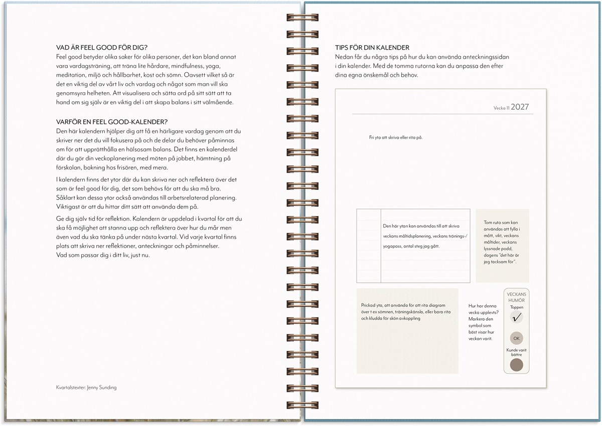 Feel good-kalendern hjälper dig skapa en balanserad vardag på dina villkor. Med utrymme för veckoplanering, reflektion och to-do-listor blir den ett verktyg för ökat välmående. Varje kvartal ger dig chans att stanna upp, blicka bakåt och sätta riktning framåt. Kalendern bjuder också på inspirerande citat, peppande texter, vackra bilder och extra sidor för anteckningar.