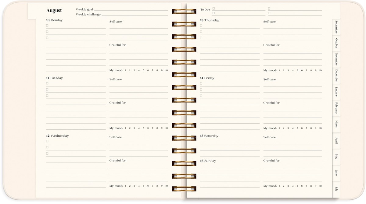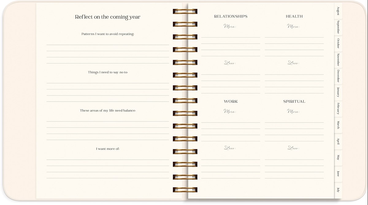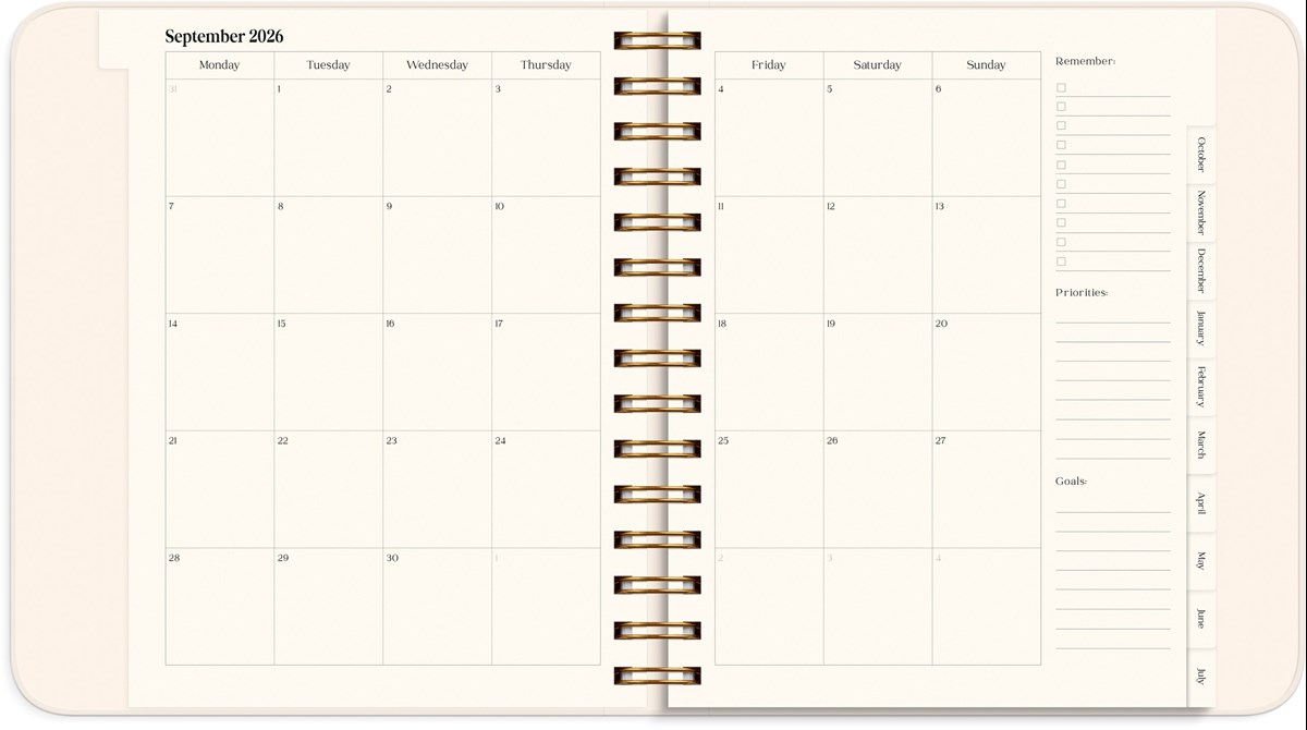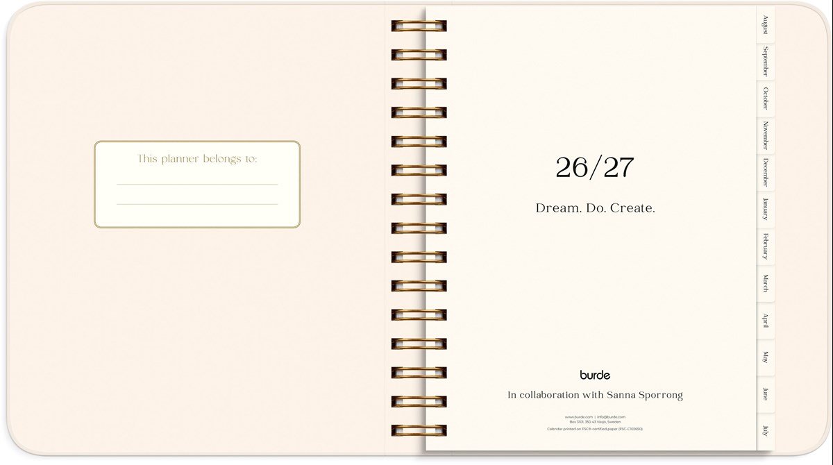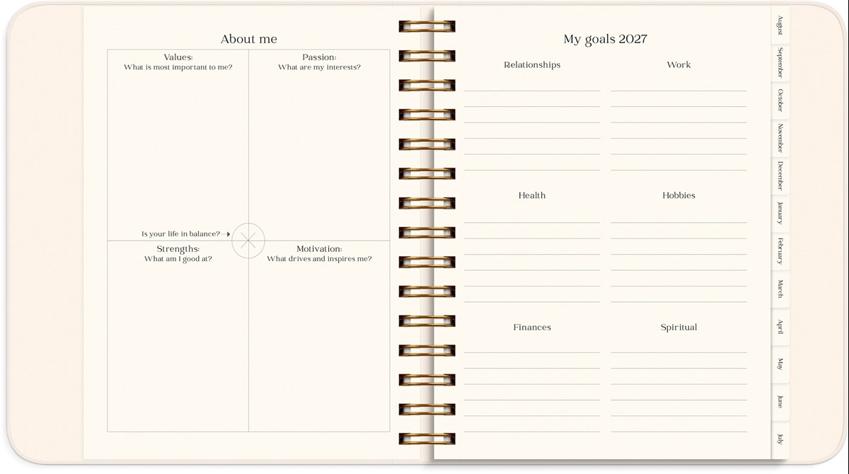 Mått: 190 x 216 x 35 mm. Layout: Vecka/uppslag. Liggande. Kalendarium: 2026-07-27 - 2027-08-29. Omslag: Kartong med sammetslen yta. Spiralbunden. Detaljer: Gummiband. Innehåll: Språk engelska, internationella helgdagar översikt, årsöversikt/årsöversikter, årsplan/årsplaner, mål, habit tracker, reflektioner, stickersark. Antal sidor: 224. Miljöinformation: FSC®.