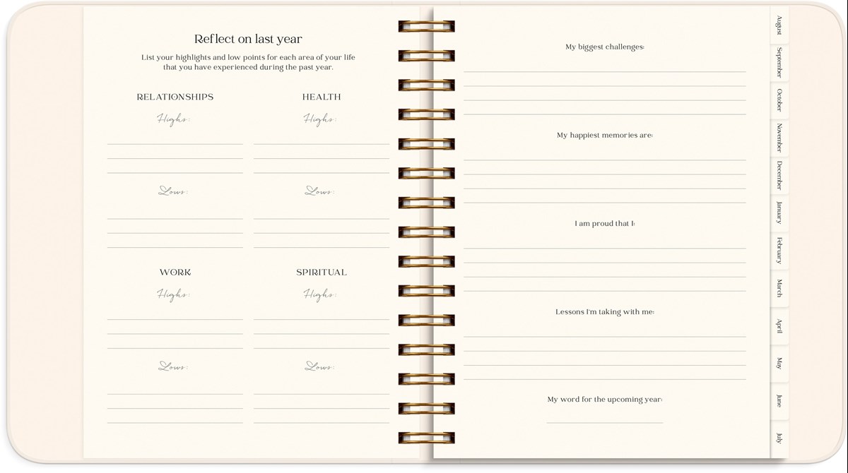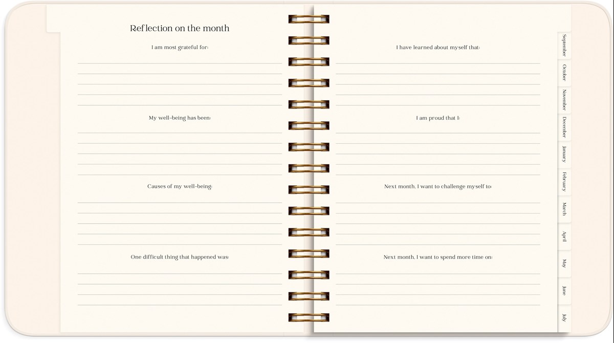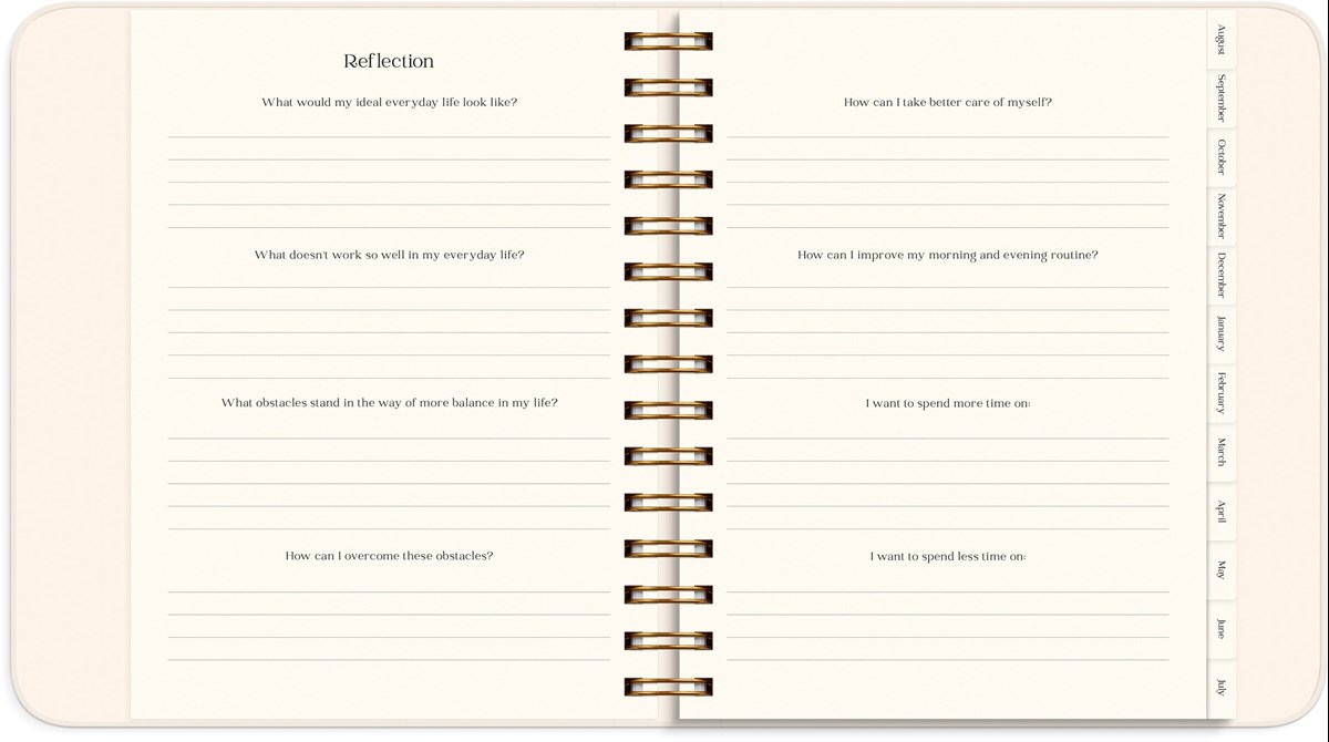 Kalendern innehåller inledande teorisidor med plats för reflektion kring ditt mående, hur du kan hitta ditt syfte i livet, visualisera och manifestera dina drömmar, och nå dina mål. Sedan följer årsplanering, månadsuppslag och veckouppslag med plats för din planering, mål, utmaningar, self care- och tacksamhetsnotering, humörnotering 1-10 och habit trackers. Efter varje månad finns ett uppslag med reflekterande frågor för att följa upp månaden som gått, och sätta intentioner och planera inför kommande månad.