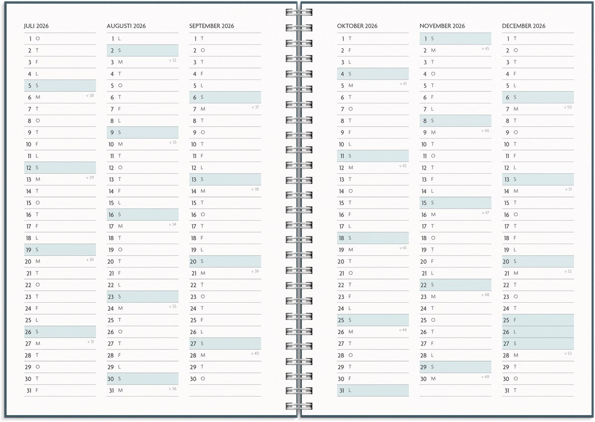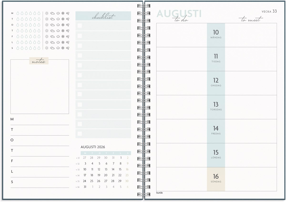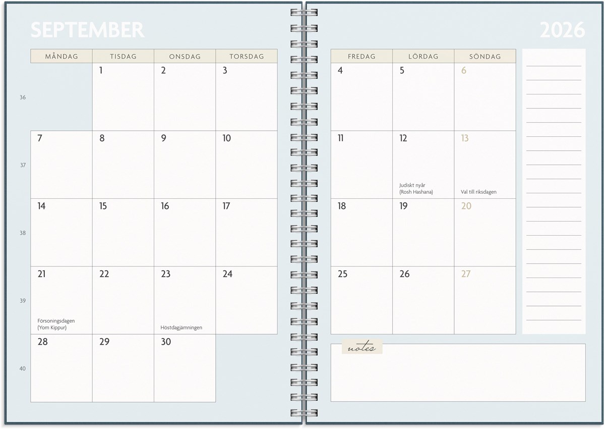 Format: A5. Mått: 17 x 218 x 160 mm. Layout: Vecka/uppslag. Liggande. Kalendarium: 2026-06-08 - 2027-06-27. Omslag: Kartong. Spiralbunden. Detaljer: Gummiband. Flyttbar plastlinjal. Pappersficka. Innehåll: Helgdagar/aftnar, månadsöversikt, temadagar/händelser, årsöversikt/årsöversikter, årsplan/årsplaner, anteckningssidor prickade, anteckningssidor linjerade, planeringslistor. Antal sidor: 160. Miljöinformation: FSC®.