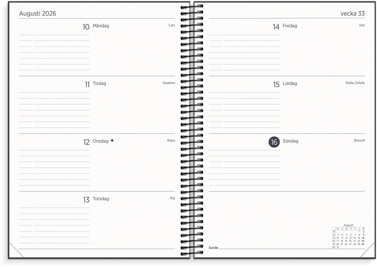 Format: A5. Mått: 170 x 217 x 24 mm. Layout: Vecka/uppslag. Liggande. Kalendarium: 2026-06-01 - 2027-07-11. Omslag: Kartong med struktur. Spiralbunden. Detaljer: Gummiband. Flyttbara plastmarkörer. Innehåll: Flaggdagar, helgdagar/aftnar, månfaser, namnsdagar, temadagar/händelser, årsöversikt/årsöversikter, årsplan/årsplaner, anteckningssidor. Antal sidor: 256. Miljöinformation: FSC®.