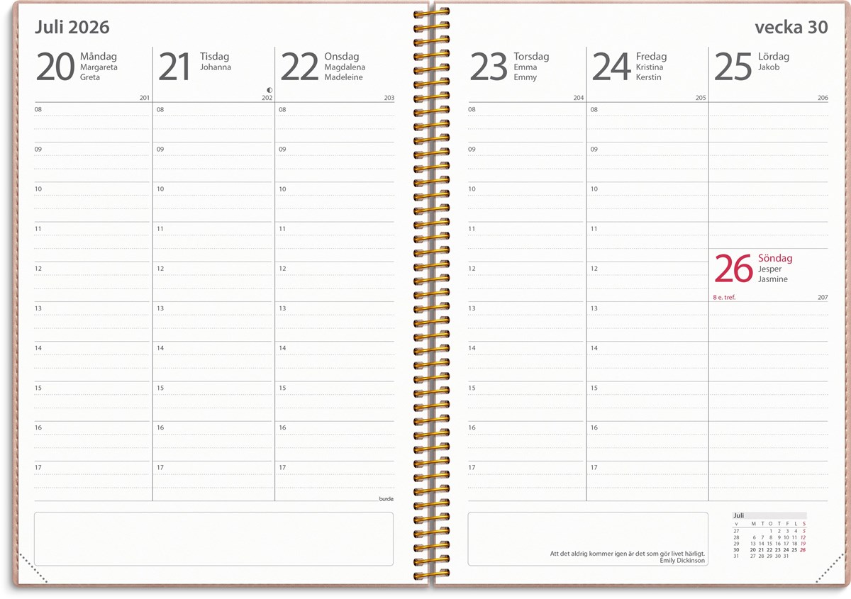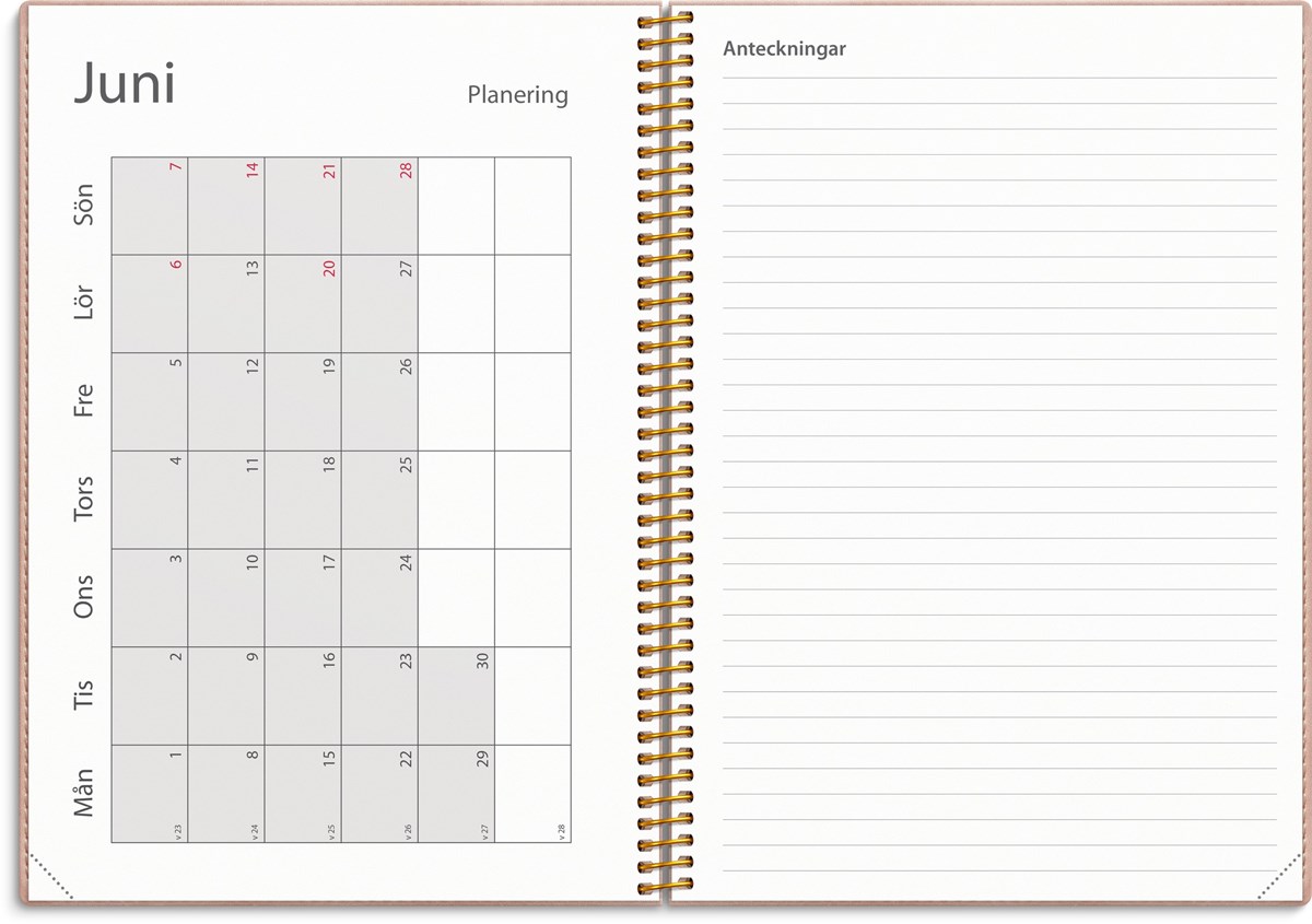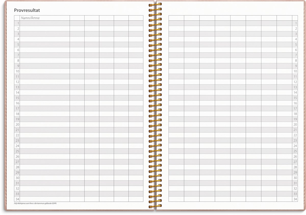 Format: A5. Layout: Stående. Vecka/uppslag. Timindelning 8-17. Kalendarium: 2025-06-02 - 2026-08-30. Omslag: Konstläder. Spiralbunden. Detaljer: Pappersficka. Innehåll: Årsplaner, schema, provresultat. Antal sidor: 176. Miljöinformation: FSC® papper.