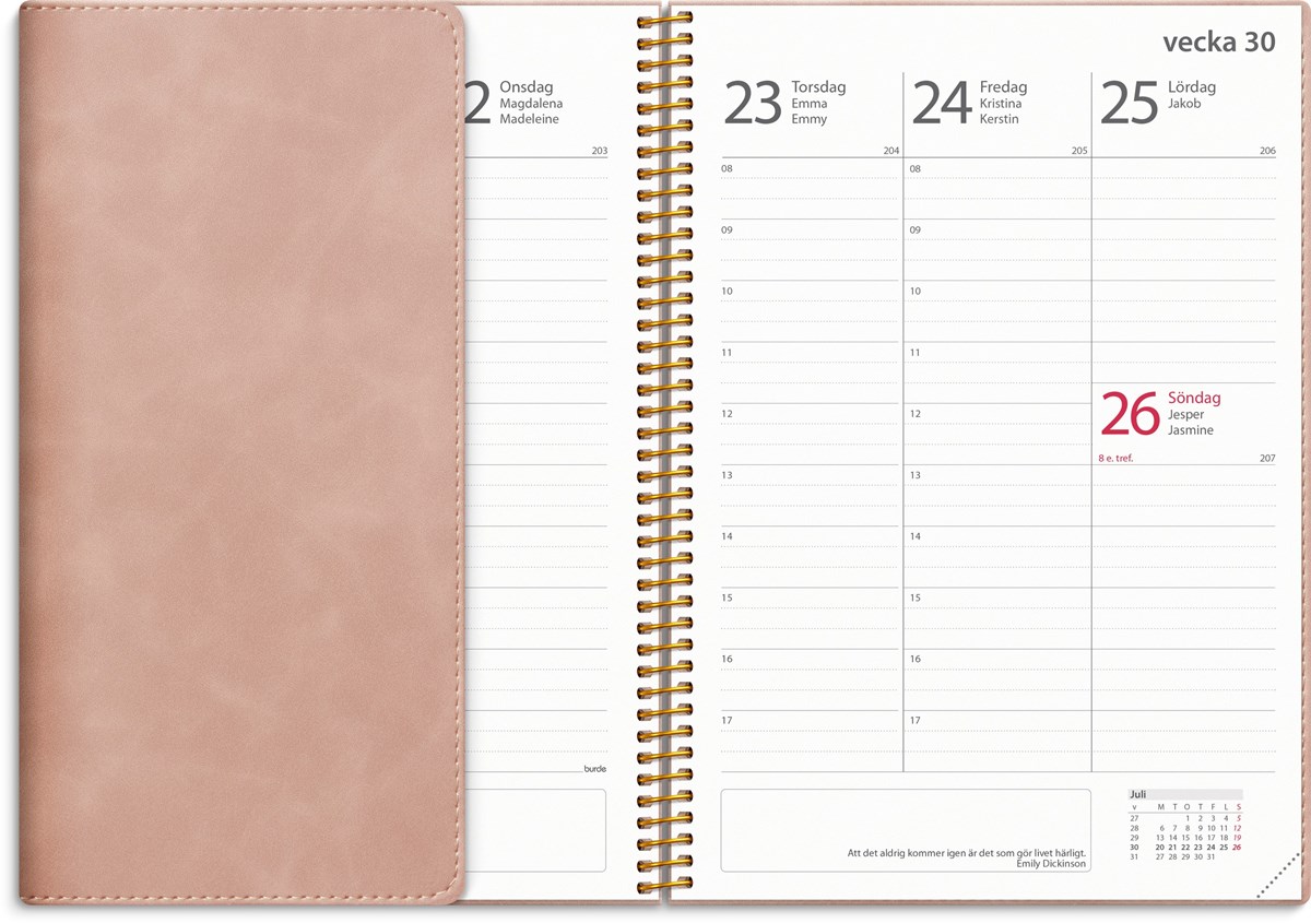 Omslaget Twist är i en sammetsmjuk skinnimitation med en användbar flärp som kan fungera som bokmärke för att enkelt förflytta dig i kalendern.