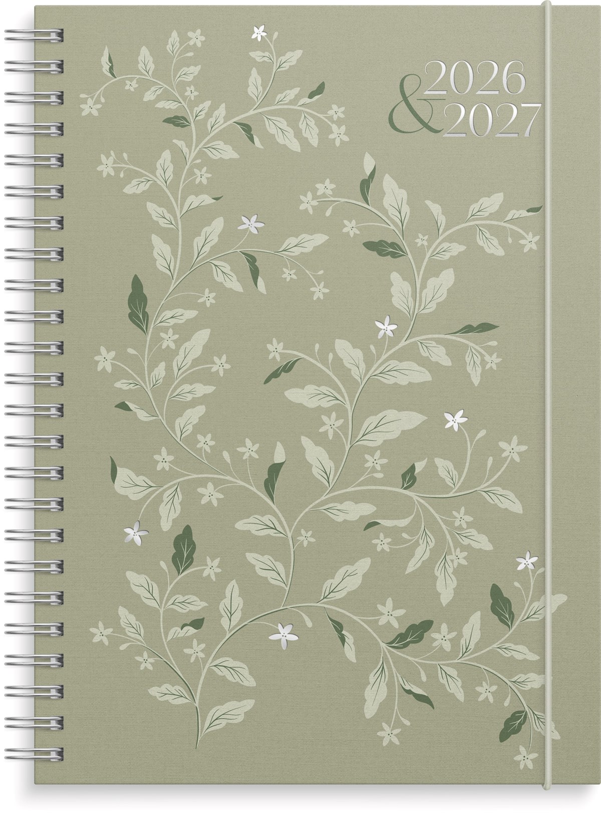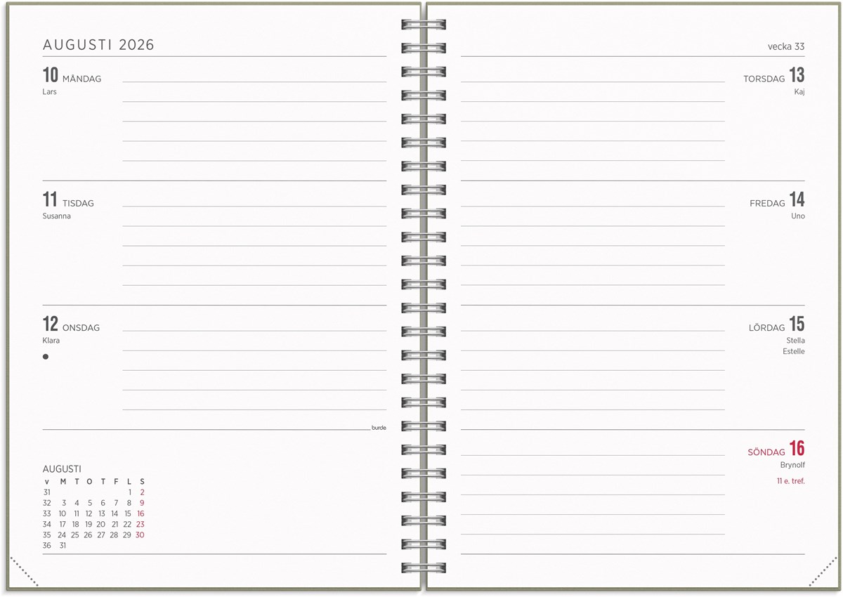 Format: A5. Mått: 163 x 17 x 215 mm. Layout: Vecka/uppslag. Stående. Kalendarium: 2026-06-01 - 2027-07-04. Omslag: Kartong med struktur. Spiralbunden. Detaljer: Gummiband. Pappersficka. Innehåll: Flaggdagar, helgdagar/aftnar, månfaser, namnsdagar, temadagar/händelser, årsöversikt/årsöversikter. Antal sidor: 144. Miljöinformation: FSC®.