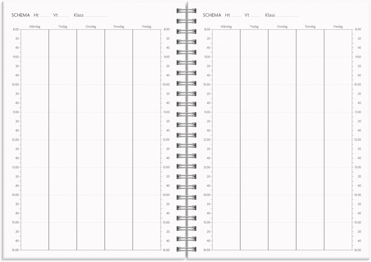 Format: A5. Mått: 163 x 17 x 215 mm. Layout: Vecka/uppslag. Stående. Timindelning 8-17. Kalendarium: 2026-06-01 - 2027-08-29. Omslag: Kartong. Spiralbunden. Detaljer: Gummiband. Innehåll: Kyrkliga helgdagar, flaggdagar, helgdagar/aftnar, månfaser, namnsdagar, temadagar/händelser, årsplan/årsplaner, schema, provresultat. Antal sidor: 176. Miljöinformation: FSC®.