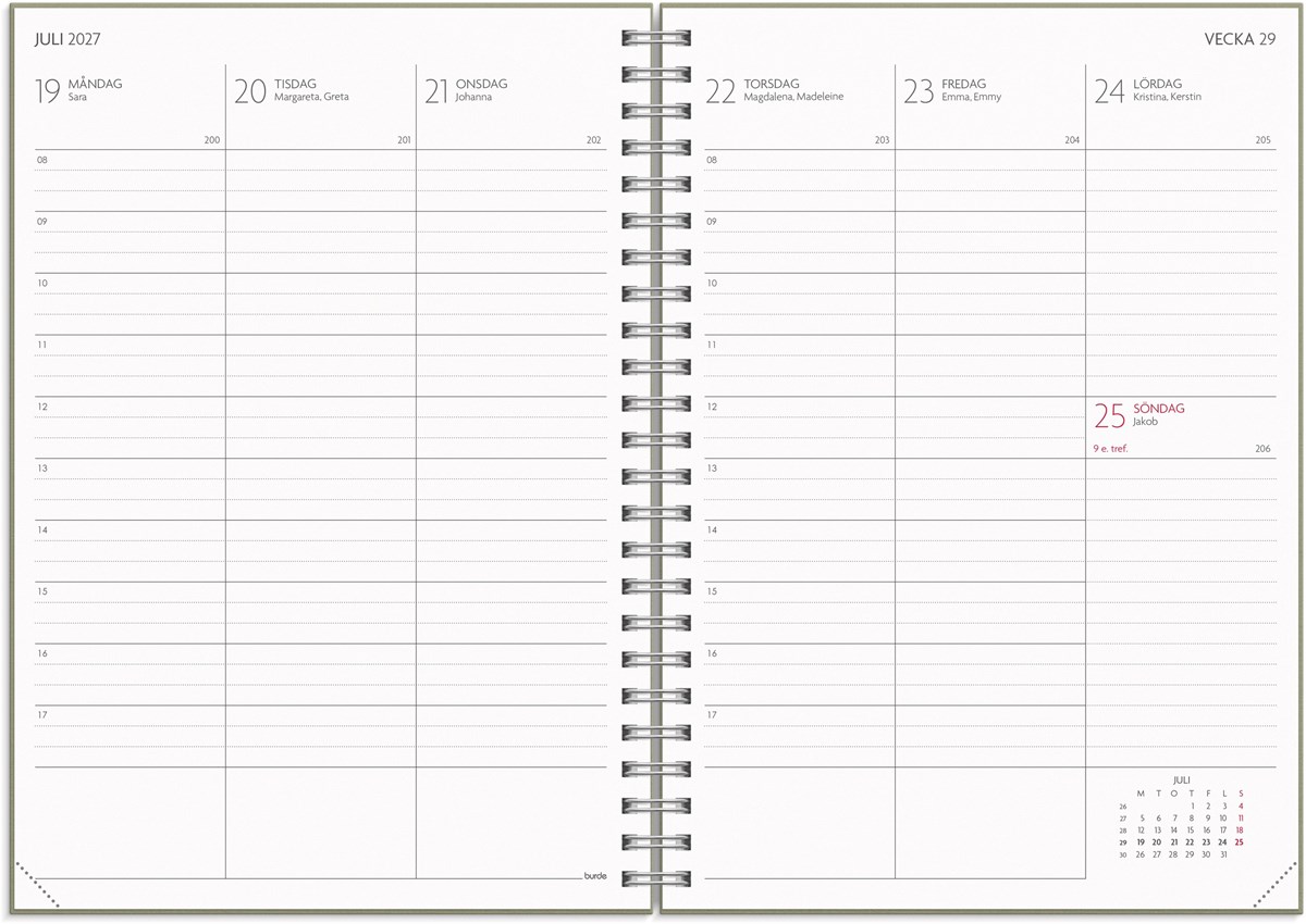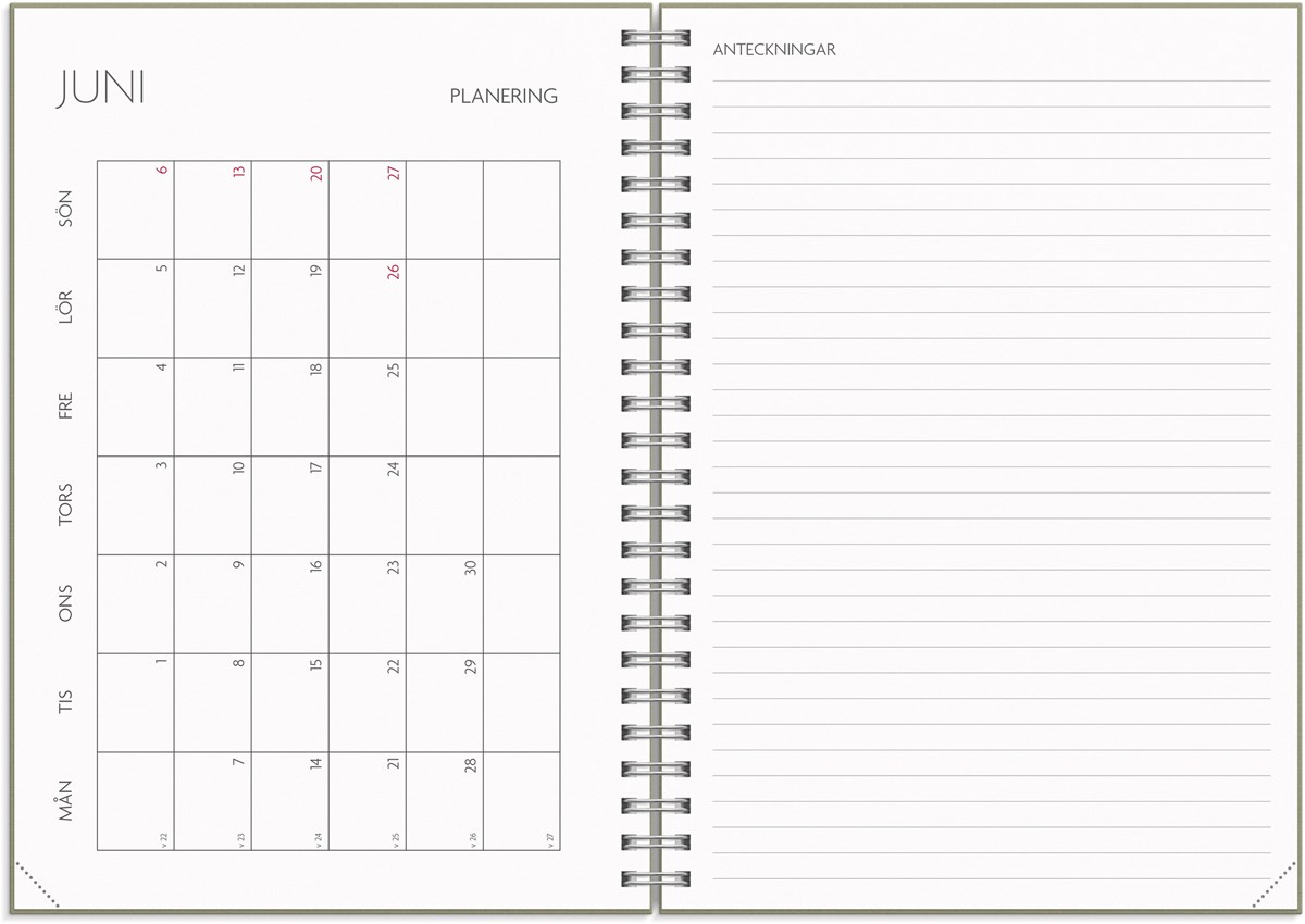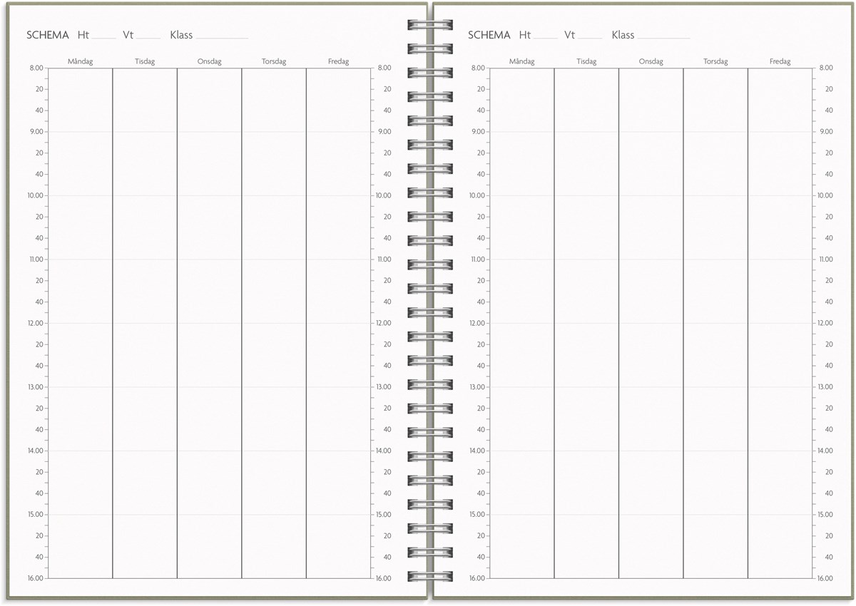 Format: A5. Mått: 163 x 17 x 215 mm. Layout: Vecka/uppslag. Stående. Timindelning 8-17. Kalendarium: 2026-06-01 - 2027-08-29. Omslag: Kartong med struktur. Spiralbunden. Detaljer: Gummiband. Pappersficka. Innehåll: Kyrkliga helgdagar, flaggdagar, helgdagar/aftnar, månfaser, namnsdagar, temadagar/händelser, årsplan/årsplaner, schema, provresultat. Antal sidor: 176. Miljöinformation: FSC®.