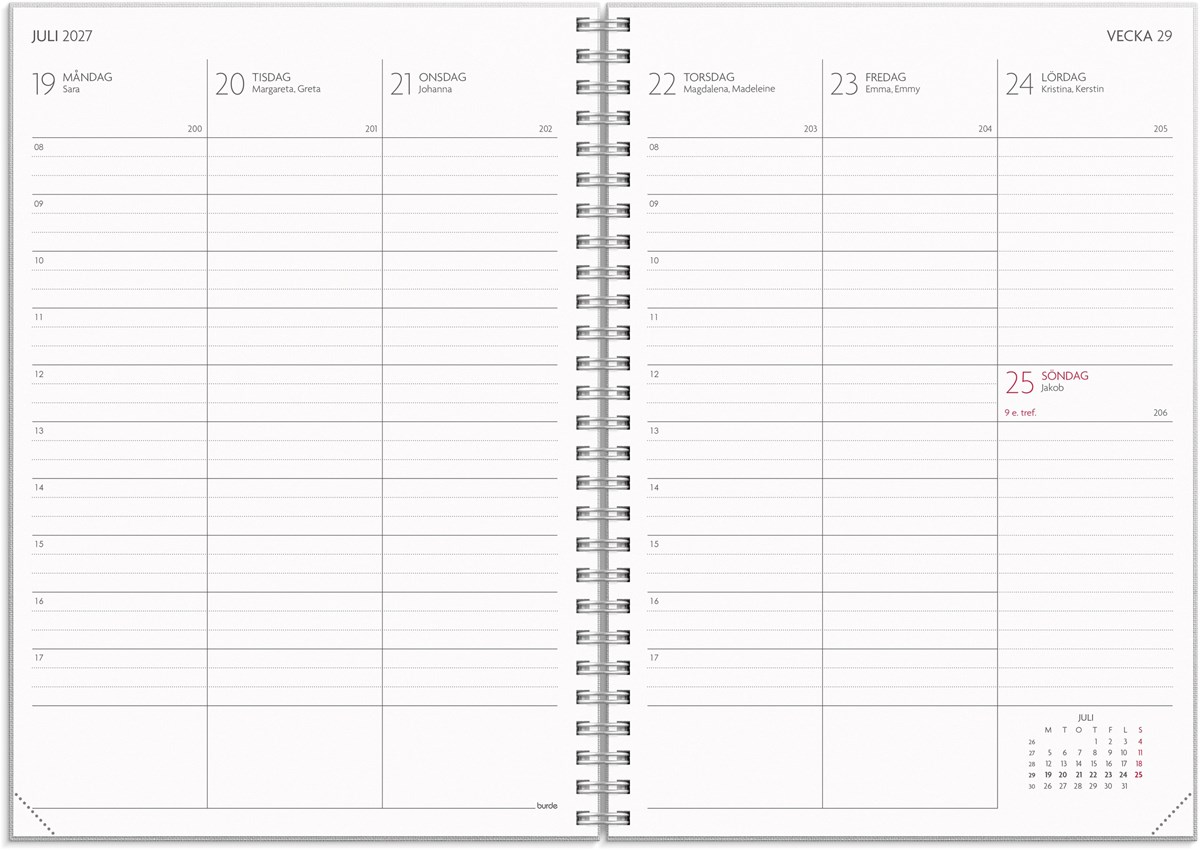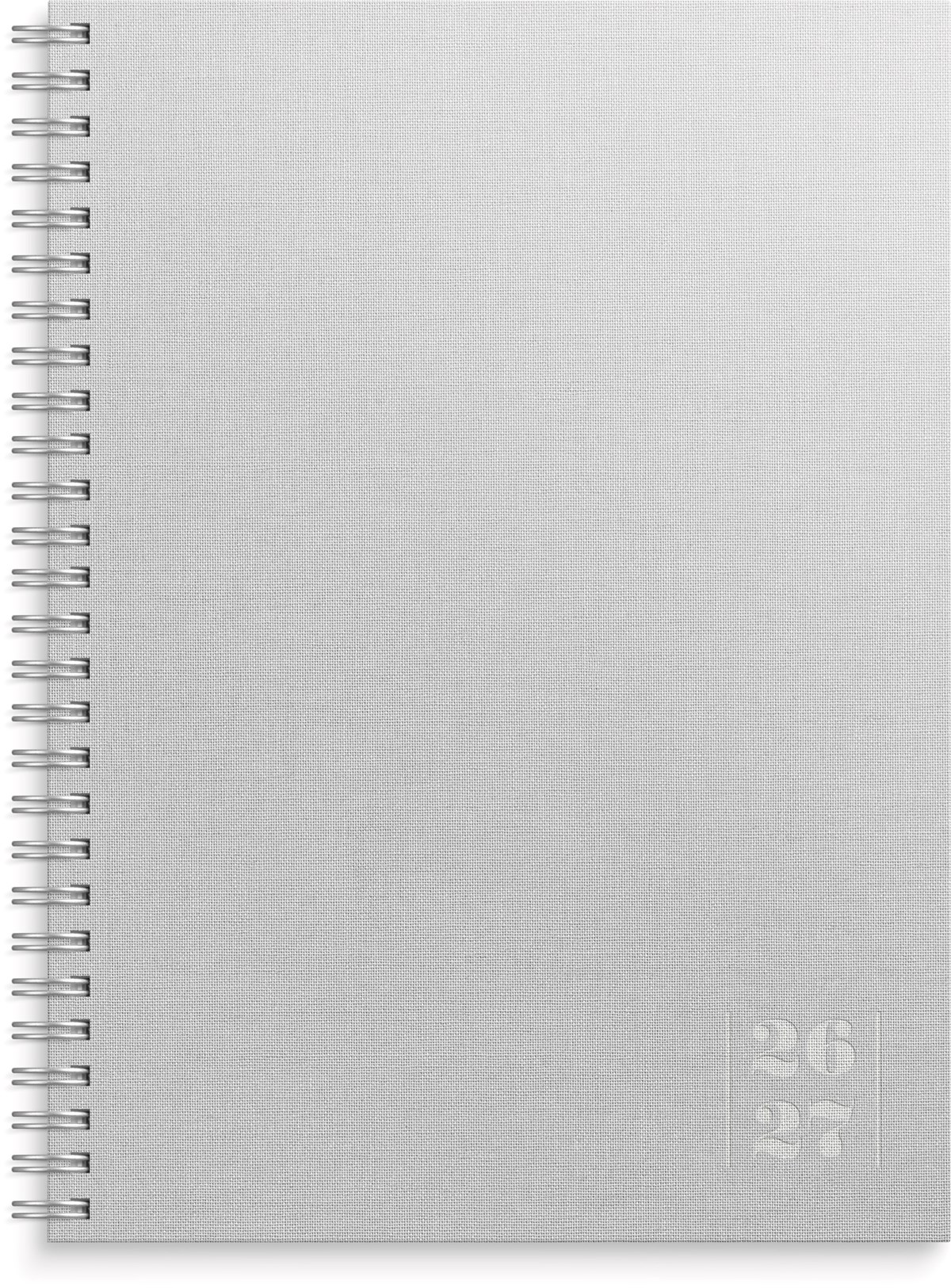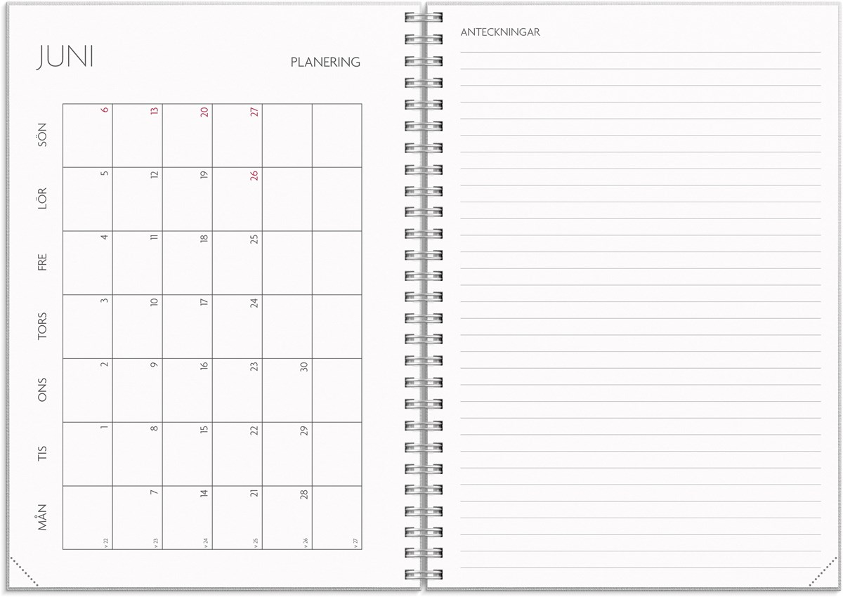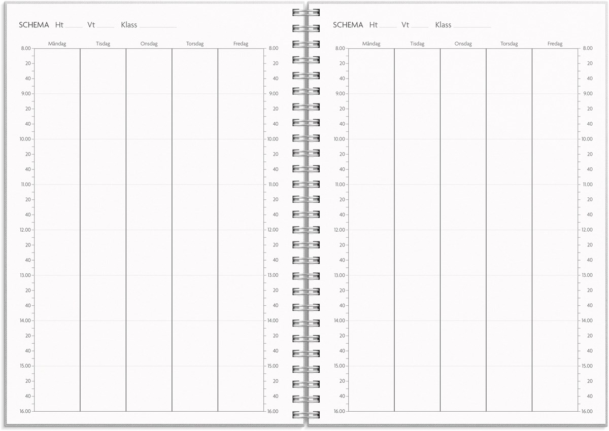 Format: A5. Mått: 163 x 215 x 17 mm. Layout: Vecka/uppslag. Stående. Timindelning 8-17. Kalendarium: 2026-06-01 - 2027-08-29. Omslag: Linnetextil. Spiralbunden. Detaljer: Pappersficka. Innehåll: Kyrkliga helgdagar, flaggdagar, helgdagar/aftnar, månfaser, namnsdagar, temadagar/händelser, årsplan/årsplaner, schema, provresultat. Antal sidor: 176. Miljöinformation: FSC®.