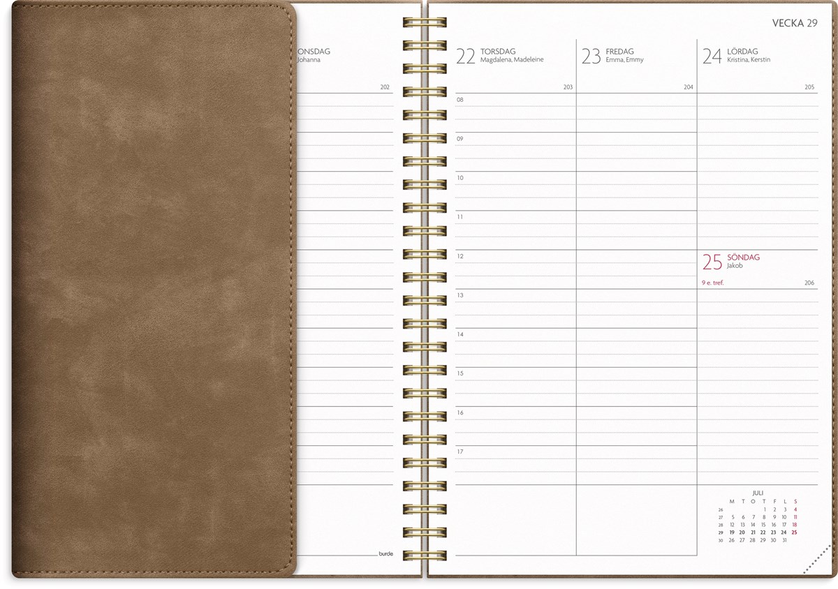 Format: A5. Mått: 215 x 163 x 17 mm. Layout: Vecka/uppslag. Stående. Timindelning 8-17. Kalendarium: 2026-06-01 - 2027-08-29. Omslag: Konstläder. Spiralbunden. Innehåll: Kyrkliga helgdagar, flaggdagar, helgdagar/aftnar, månfaser, namnsdagar, temadagar/händelser, årsplan/årsplaner, schema, provresultat. Antal sidor: 176. Miljöinformation: FSC® papper.