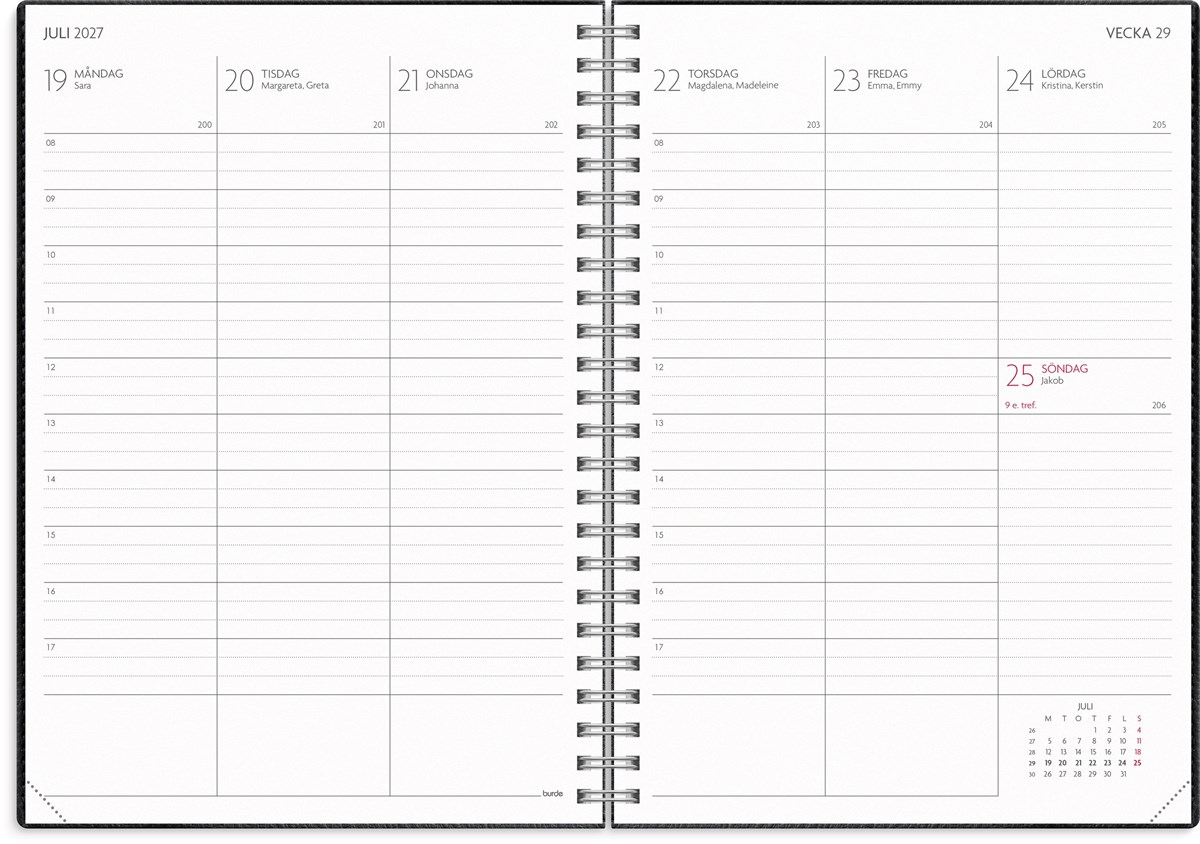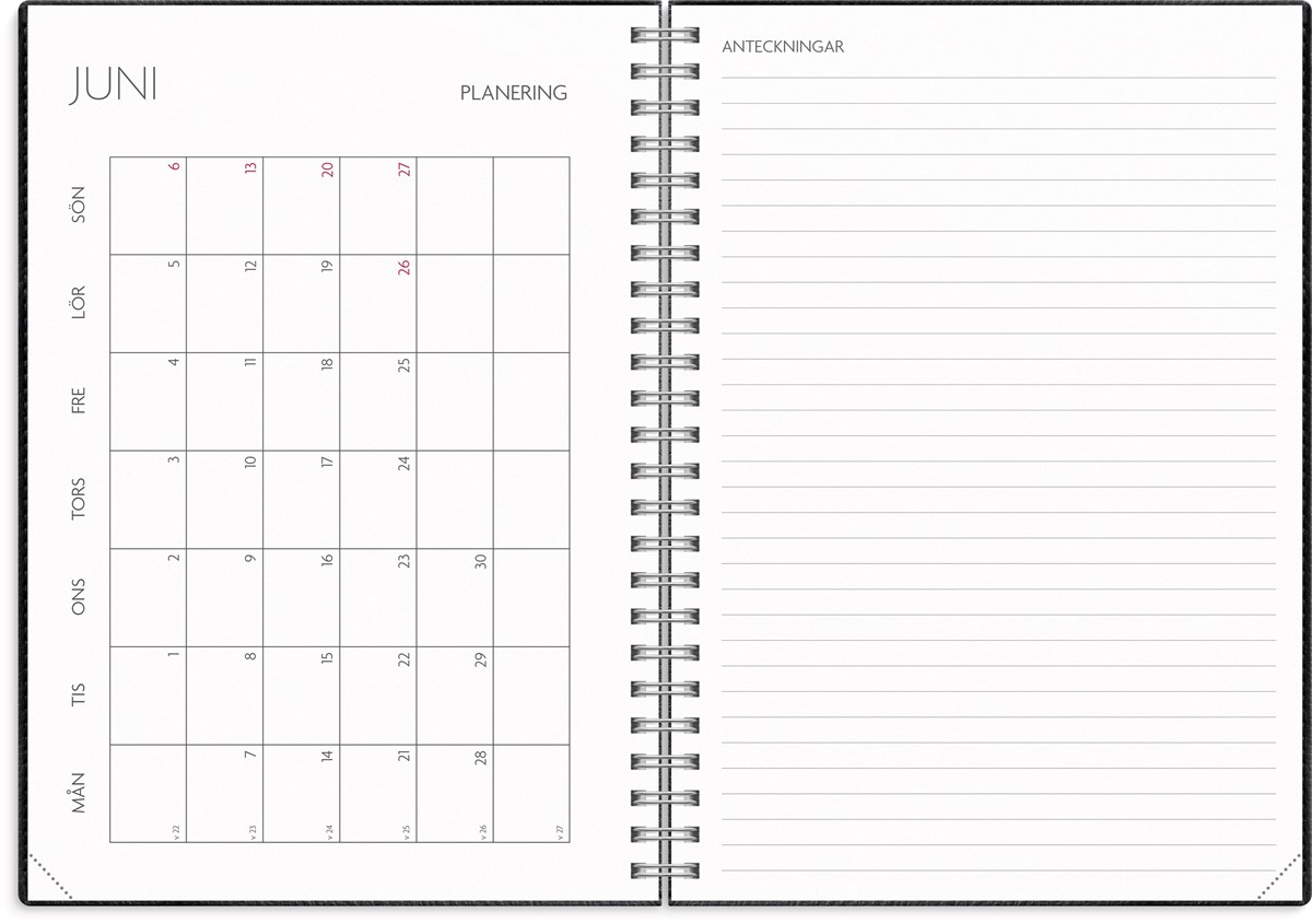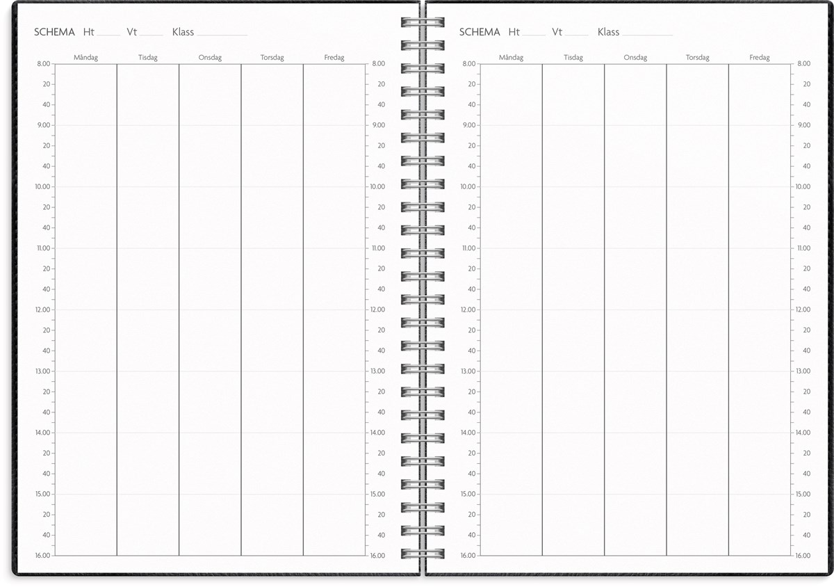 Format: A5. Mått: 215 x 163 x 17 mm. Layout: Vecka/uppslag. Stående. Timindelning 8-17. Kalendarium: 2026-06-01 - 2027-08-29. Omslag: Konstläder. Spiralbunden. Innehåll: Kyrkliga helgdagar, flaggdagar, helgdagar/aftnar, månfaser, namnsdagar, temadagar/händelser, årsplan/årsplaner, schema, provresultat. Antal sidor: 176. Miljöinformation: FSC® papper.