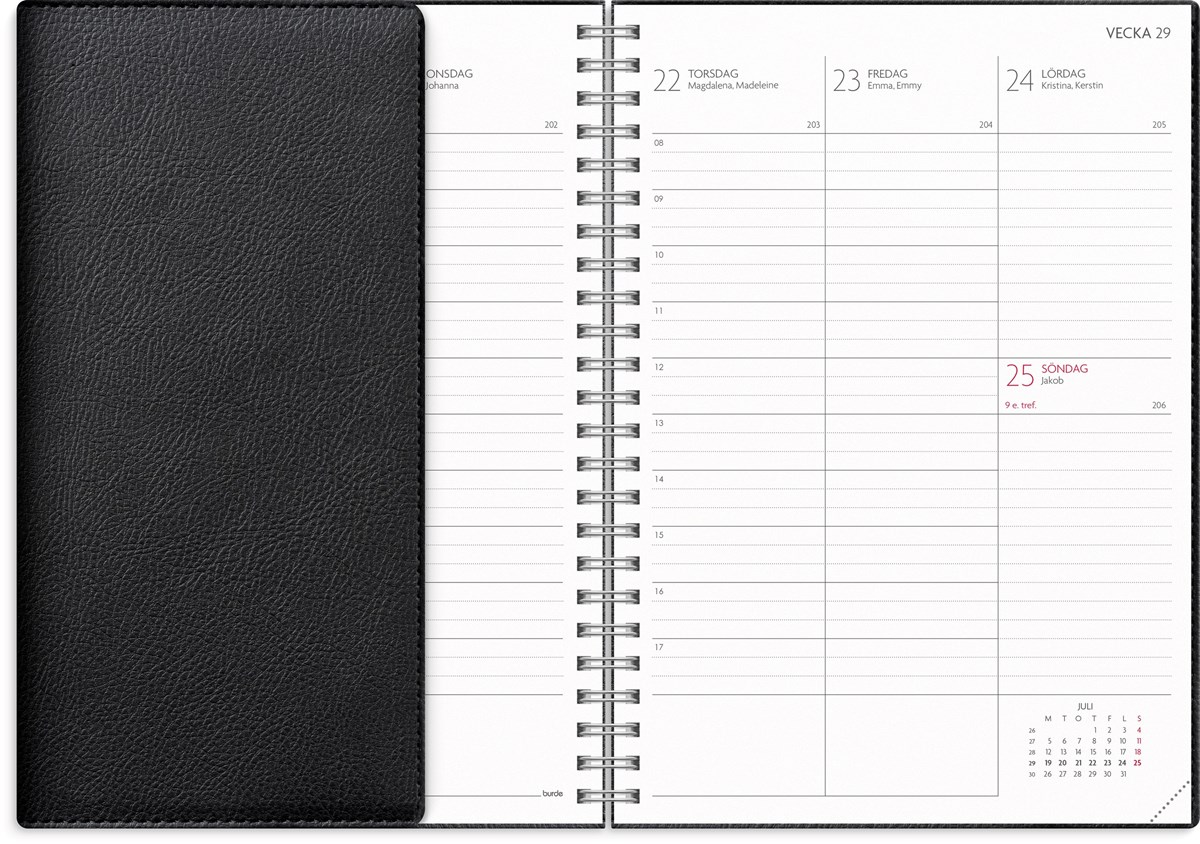 Omslaget Twist Svart har en len strukturerad skinnimitation med en användbar flärp som kan fungera som ett bokmärke för att enkelt förflytta dig i kalendern.