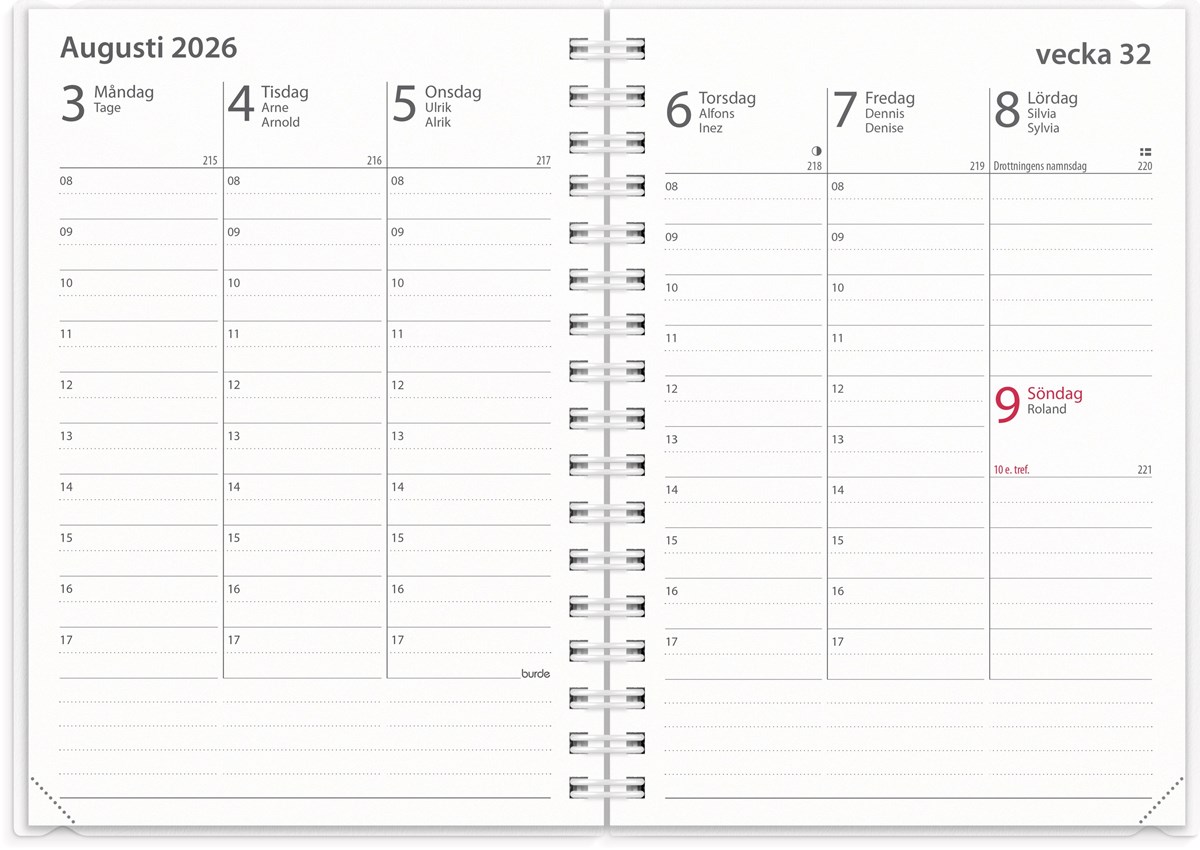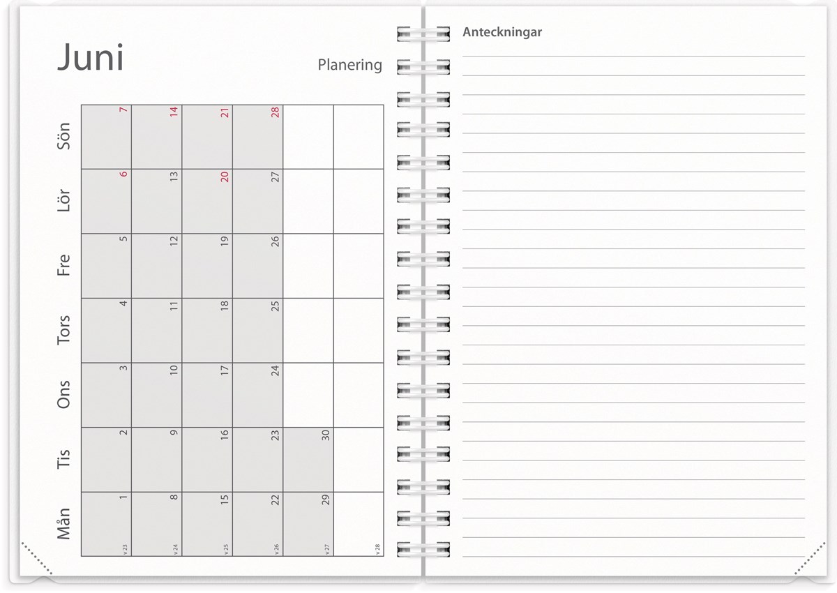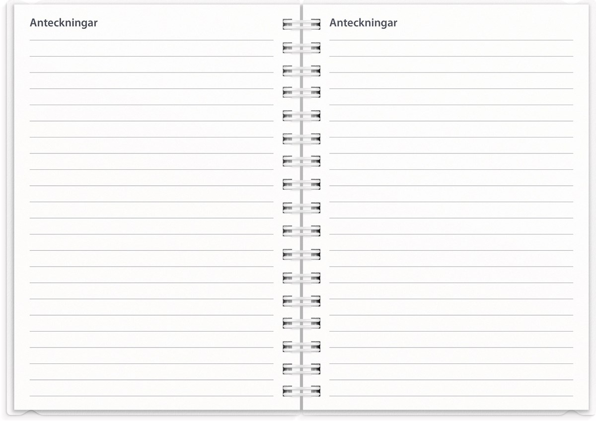 Format: A6. Mått: 156 x 17 x 120 mm. Layout: Vecka/uppslag. Stående. Timindelning 8-17. Kalendarium: 2026-06-15 - 2027-08-15. Omslag: PP-plast och plastficka med tryckt blad. Spiralbunden. Detaljer: Gummiband. Innehåll: Kyrkliga helgdagar, flaggdagar, helgdagar/aftnar, månfaser, namnsdagar, internationella helgdagar översikt, temadagar/händelser, årsplan/årsplaner, schema, provresultat. Antal sidor: 176. Miljöinformation: FSC®.