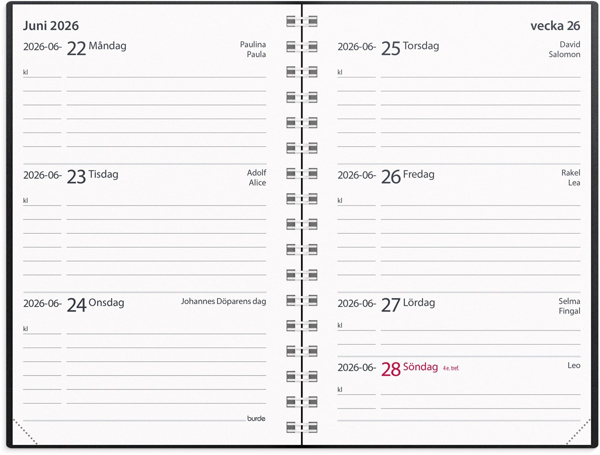 Mått: 12 x 135 x 90 mm. Layout: Vecka/uppslag. Liggande. Kalendarium: 2026-06-01 - 2027-07-11. Omslag: Plast. Spiralbunden. Innehåll: Kyrkliga helgdagar, flaggdagar, helgdagar/aftnar, månfaser, namnsdagar, temadagar/händelser, årsöversikt/årsöversikter, årsplan/årsplaner, atlas, faktasidor, anteckningshäfte, schema, provresultat. Antal sidor: 160. Miljöinformation: FSC®.