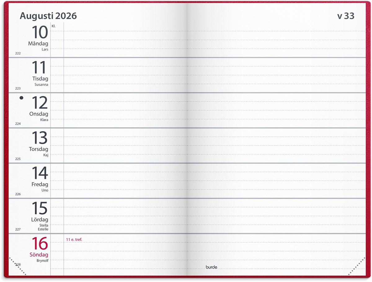 Format: 82x127 mm. Layout: Liggande. Vecka/uppslag. Kalendarium: 2025-12-15 - 2027-01-03. Omslag: Konstläder. Inbunden. Innehåll: Atlas, Kyrkliga helgdagar, Flaggdagar, Helgdagar/aftnar, Månfaser, Namnsdagar, Internationella helgdagar översikt, Löst telefonregister, Temadagar/händelser, Årsöversikt/årsöversikter, Årsplan/årsplaner. Antal sidor: 168. Miljöinformation: FSC® papper.