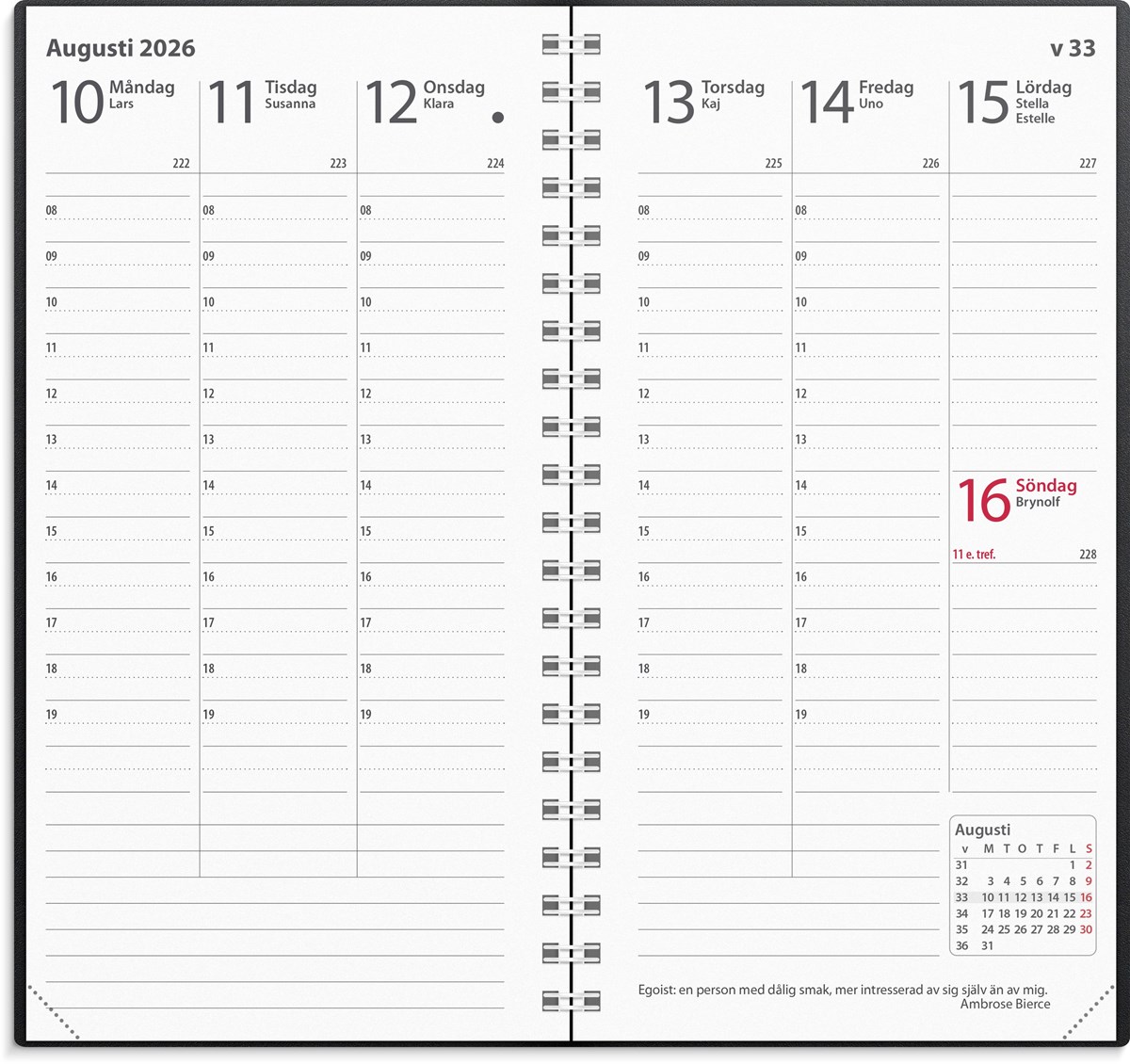 Format: 83x158 mm. Layout: Stående. Vecka/uppslag. Timindelning 8-19. Kalendarium: 2025-12-22 - 2027-01-03. Omslag: Plast. Spiralbunden. Innehåll: Kyrkliga helgdagar, Flaggdagar, Helgdagar/aftnar, Månfaser, Namnsdagar, Internationella helgdagar översikt, Telefonregister, Temadagar/händelser, Årsöversikt/årsöversikter, Årsplan/årsplaner. Antal sidor: 128. Miljöinformation: FSC®.