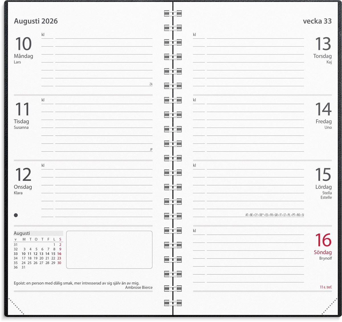 Format: 83x158 mm. Layout: Liggande. Vecka/uppslag. Kalendarium: 2025-12-08 - 2027-01-03. Omslag: Konstläder. Spiralbunden. Innehåll: Atlas, Kyrkliga helgdagar, Flaggdagar, Helgdagar/aftnar, Internationella helgdagar, Månfaser, Namnsdagar, Internationella helgdagar översikt, Telefonregister, Temadagar/händelser, Årsöversikt/årsöversikter, Årsplan/årsplaner. Antal sidor: 128. Miljöinformation: FSC®.