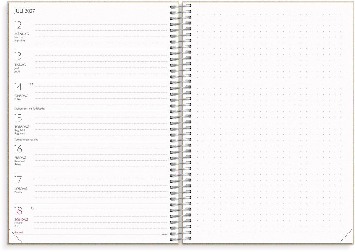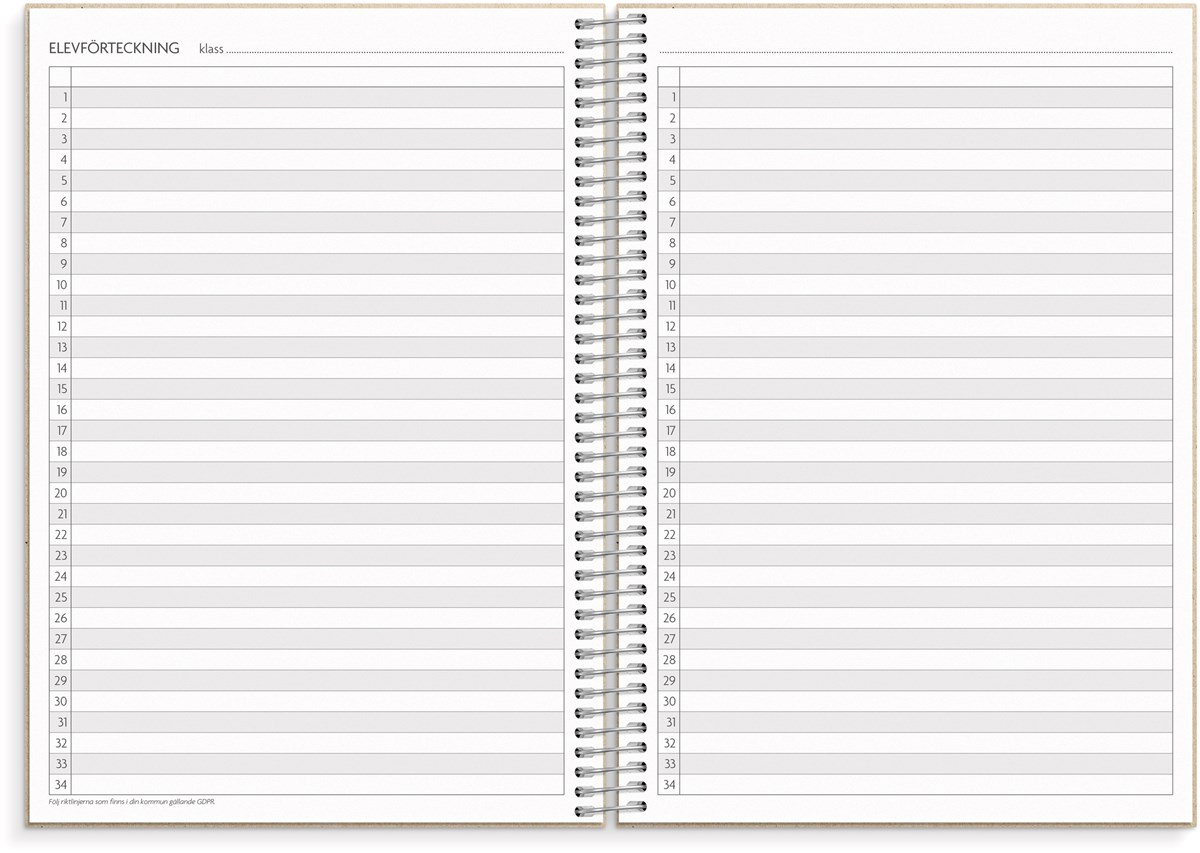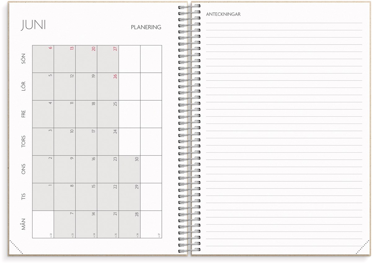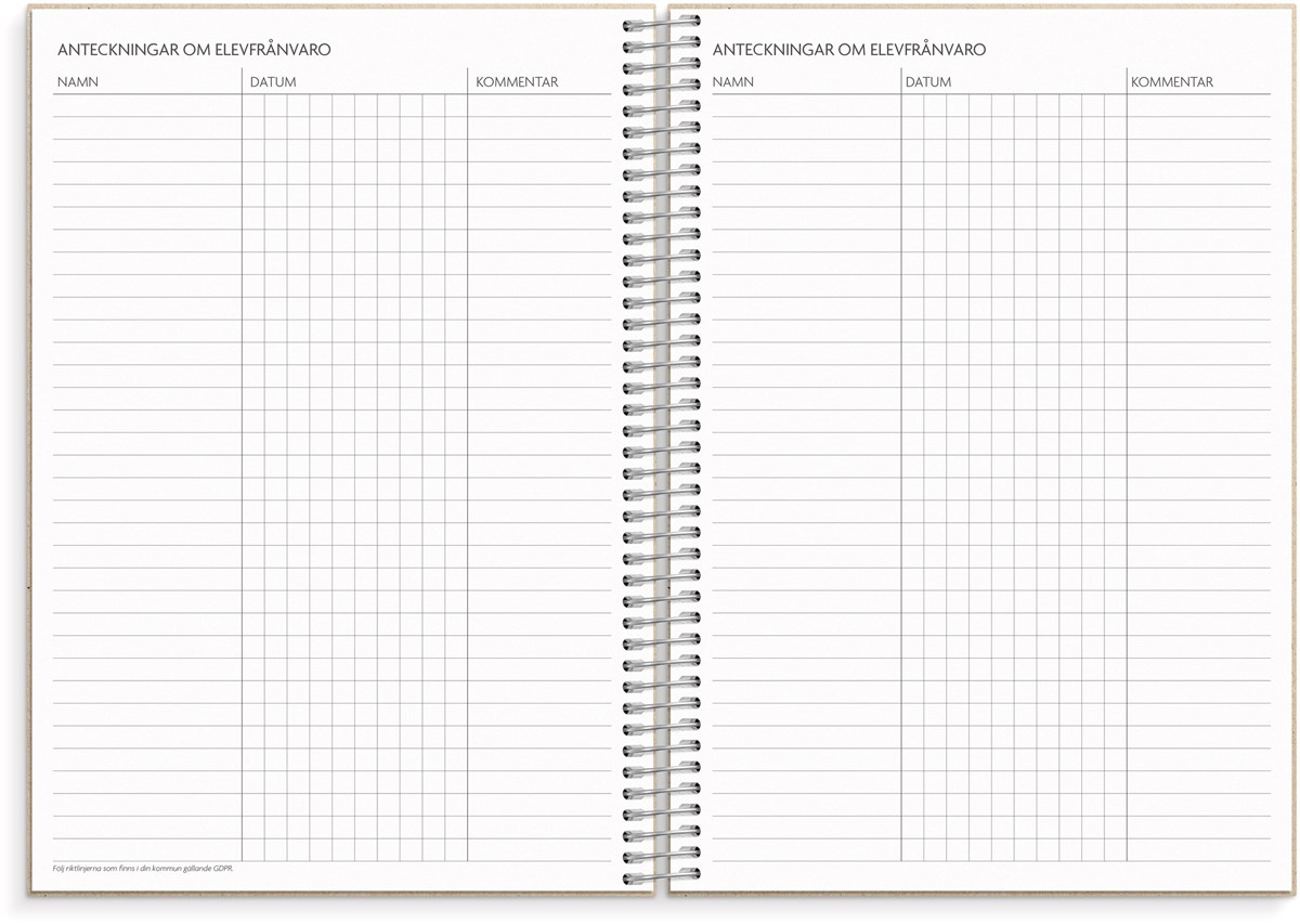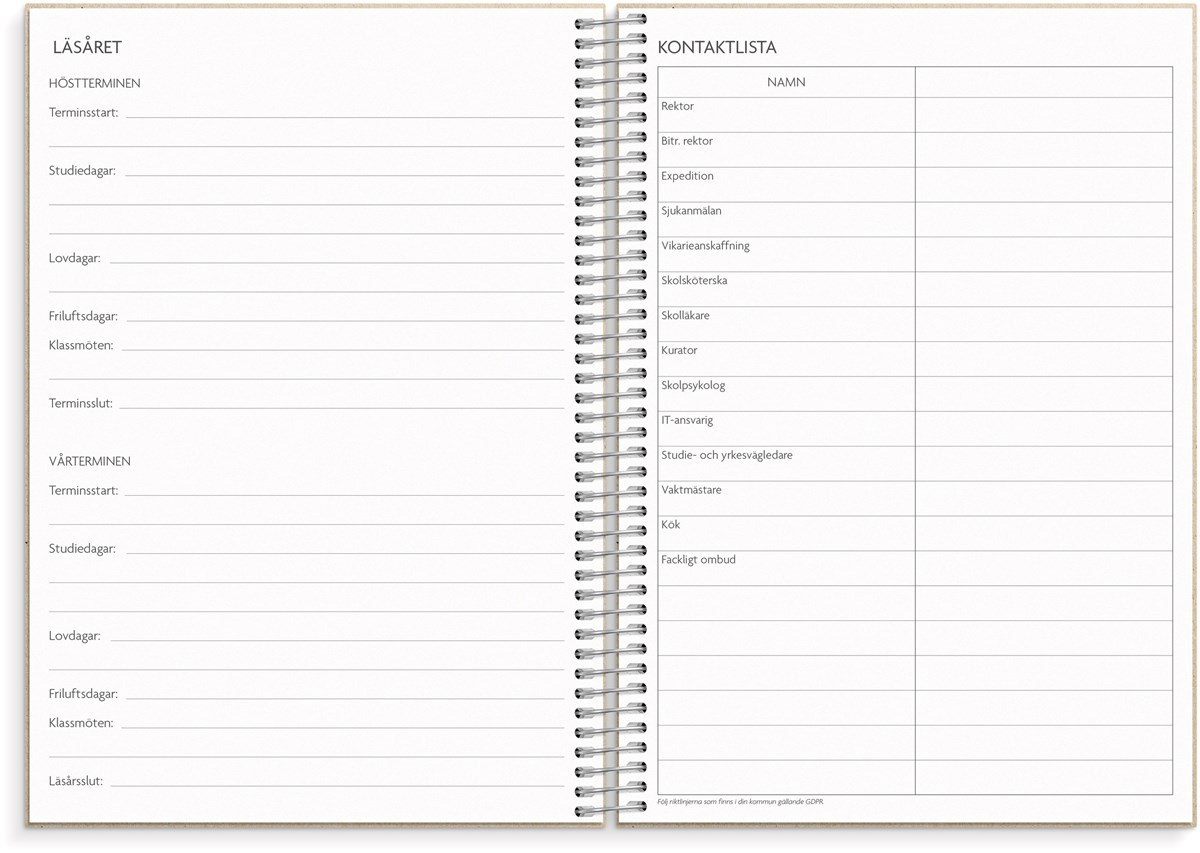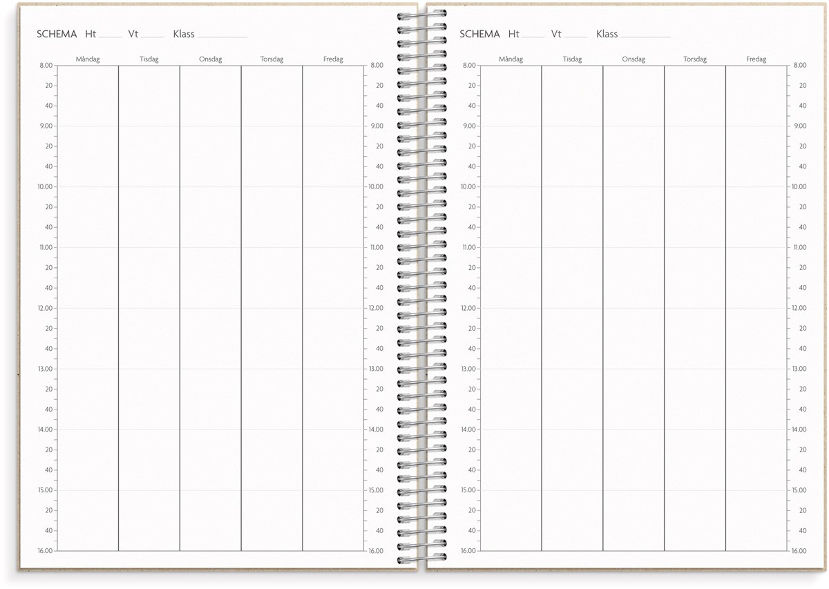 Format: A5. Mått: 215 x 25 x 175 mm. Layout: Vecka/uppslag. Liggande. Kalendarium: 2026-06-08 - 2027-08-22. Omslag: Återvunnen kartong. Spiralbunden. Detaljer: Gummiband. Flyttbar plastlinjal. Pappersficka. Innehåll: Kyrkliga helgdagar, flaggdagar, helgdagar/aftnar, månfaser, namnsdagar, temadagar/händelser, årsplan/årsplaner, kontaktlista, utvikbar namnlista, anteckningssidor, schema, elevfrånvaro, elevförteckning. Antal sidor: 256. Miljöinformation: FSC®. Omslag i återvunnen kartong.