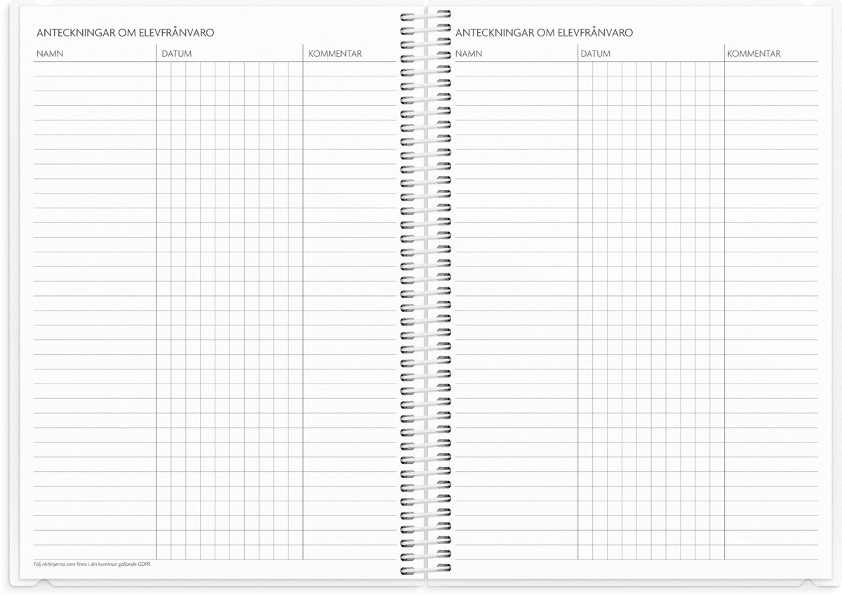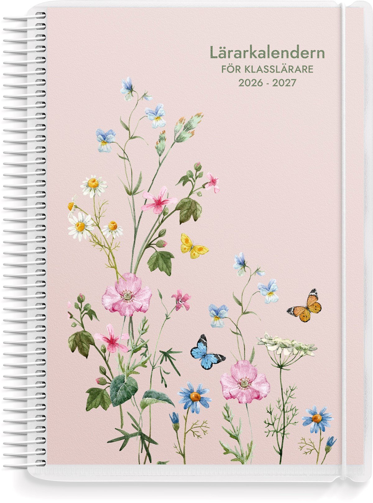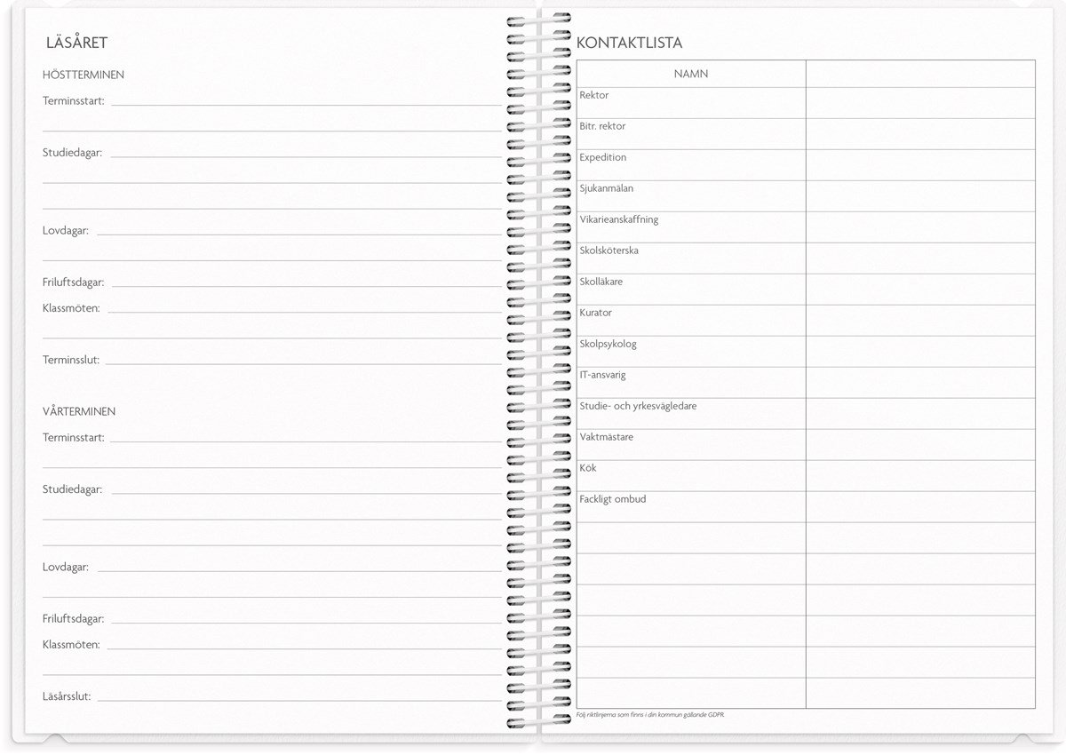 Format: A5. Mått: 15 x 160 x 215 mm. Layout: Vecka/uppslag. Stående. Timindelning 8-17. Kalendarium: 2026-06-01 - 2027-08-29. Omslag: PP-plast och plastficka med tryckt blad. Spiralbunden. Detaljer: Gummiband. Flyttbar plastlinjal. Plastficka. Innehåll: Kyrkliga helgdagar, flaggdagar, helgdagar/aftnar, månfaser, namnsdagar, temadagar/händelser, årsplan/årsplaner, kontaktlista, utvikbar namnlista, anteckningssidor, schema, elevfrånvaro, elevförteckning, provresultat. Antal sidor: 232. Miljöinformation: FSC®.