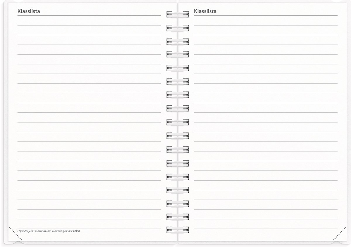 Format: A6. Mått: 15 x 118 x 157 mm. Layout: Vecka/uppslag. Liggande. Kalendarium: 2026-08-03 - 2027-08-15. Omslag: PP-plast och plastficka med tryckt blad. Spiralbunden. Detaljer: Gummiband. Plastficka. Innehåll: Kyrkliga helgdagar, flaggdagar, helgdagar/aftnar, månfaser, namnsdagar, temadagar/händelser, årsplan/årsplaner, kontaktlista, anteckningssidor, schema, elevförteckning, provresultat. Antal sidor: 128. Miljöinformation: FSC®.