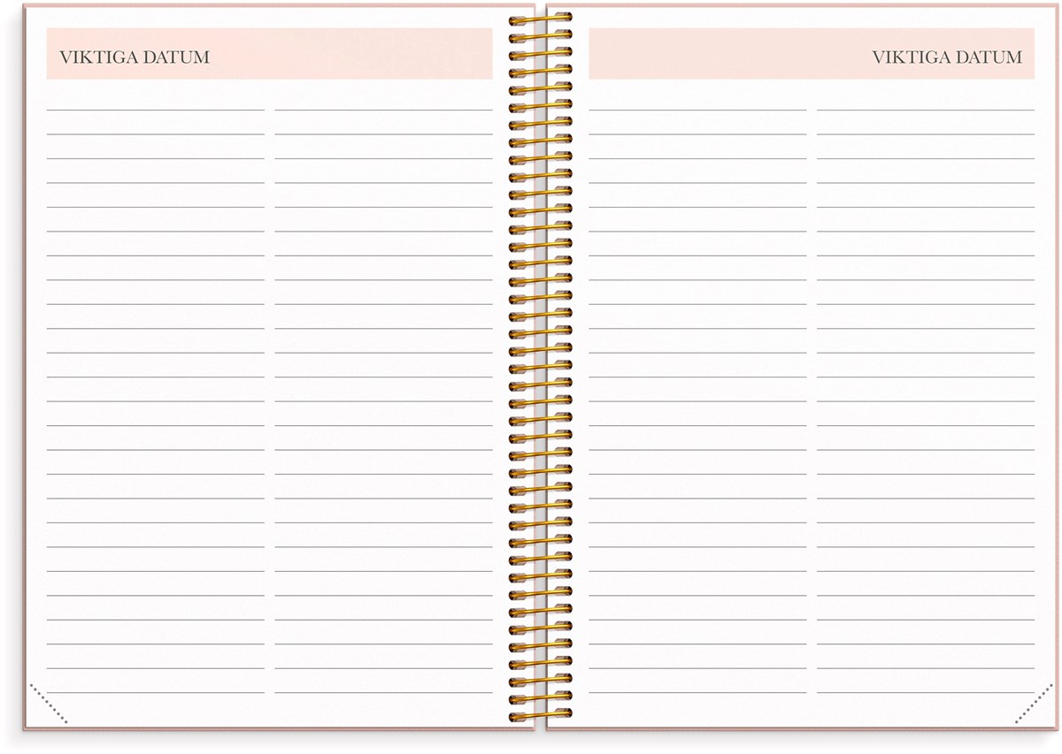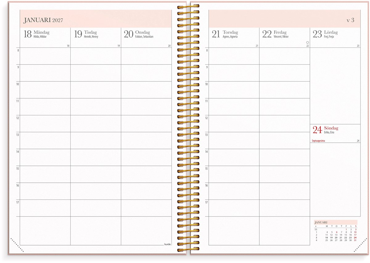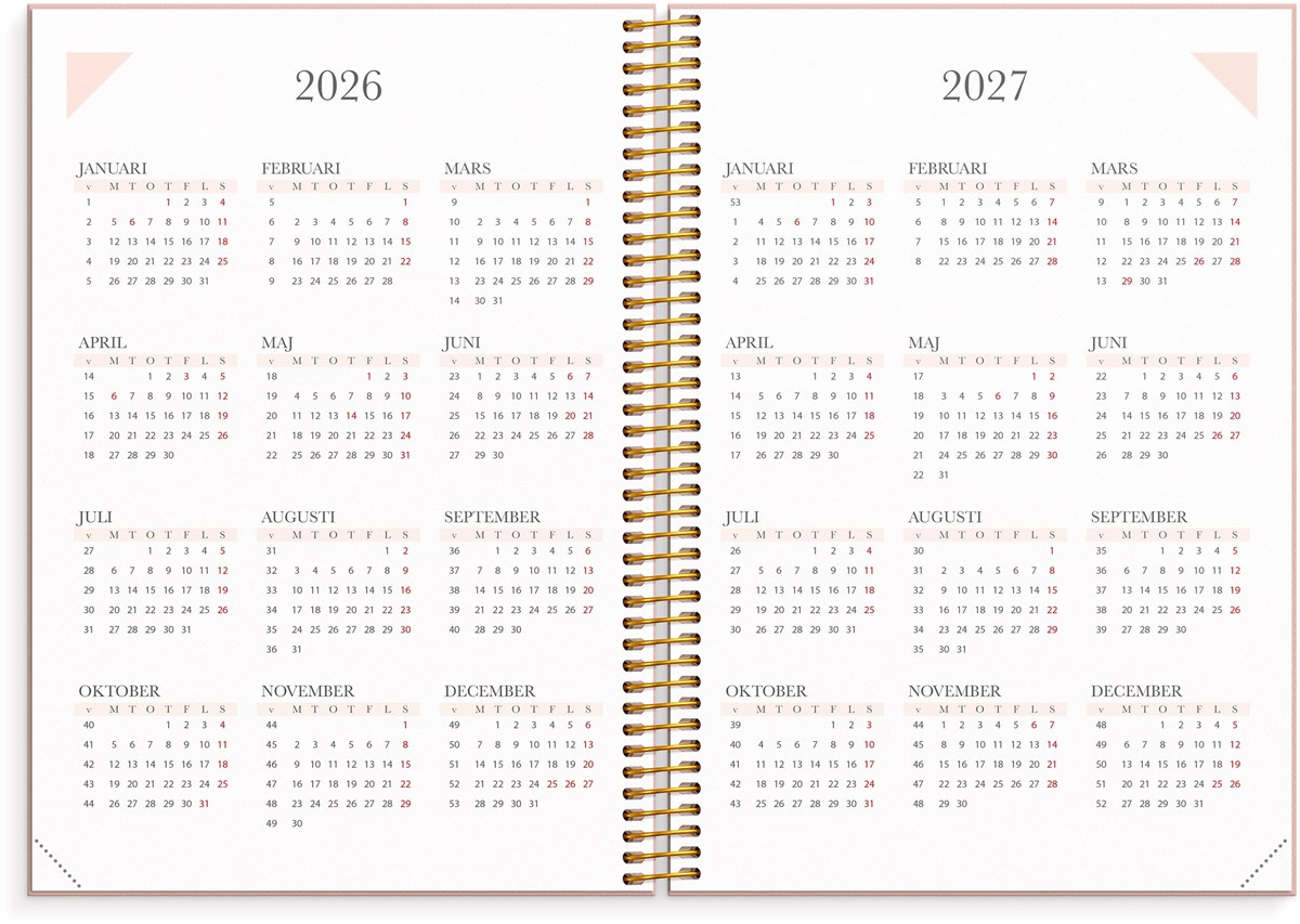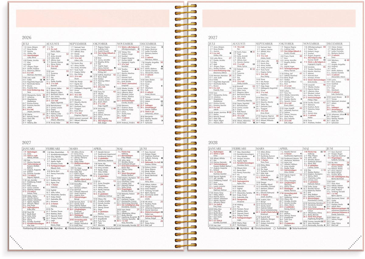 Format: A5. Mått: 215 x 25 x 175 mm. Layout: Vecka/uppslag. Stående. Timindelning 8-17. Kalendarium: 2026-06-15 - 2027-08-01. Omslag: Kartong med struktur. Spiralbunden. Detaljer: Gummiband. Flyttbara plastmarkörer. Pappersficka. Innehåll: Kyrkliga helgdagar, flaggdagar, helgdagar/aftnar, viktiga datum, månfaser, namnsdagar, temadagar/händelser, årsöversikt/årsöversikter, årsplan/årsplaner, kontaktlista, schema. Antal sidor: 224. Miljöinformation: FSC®.