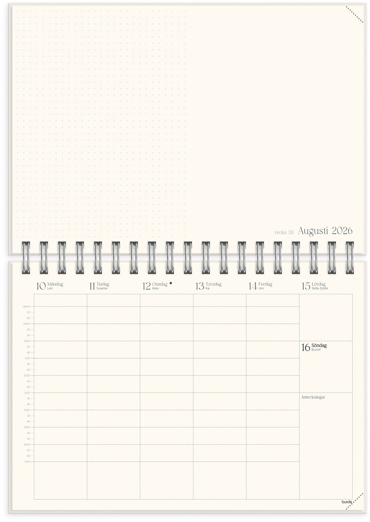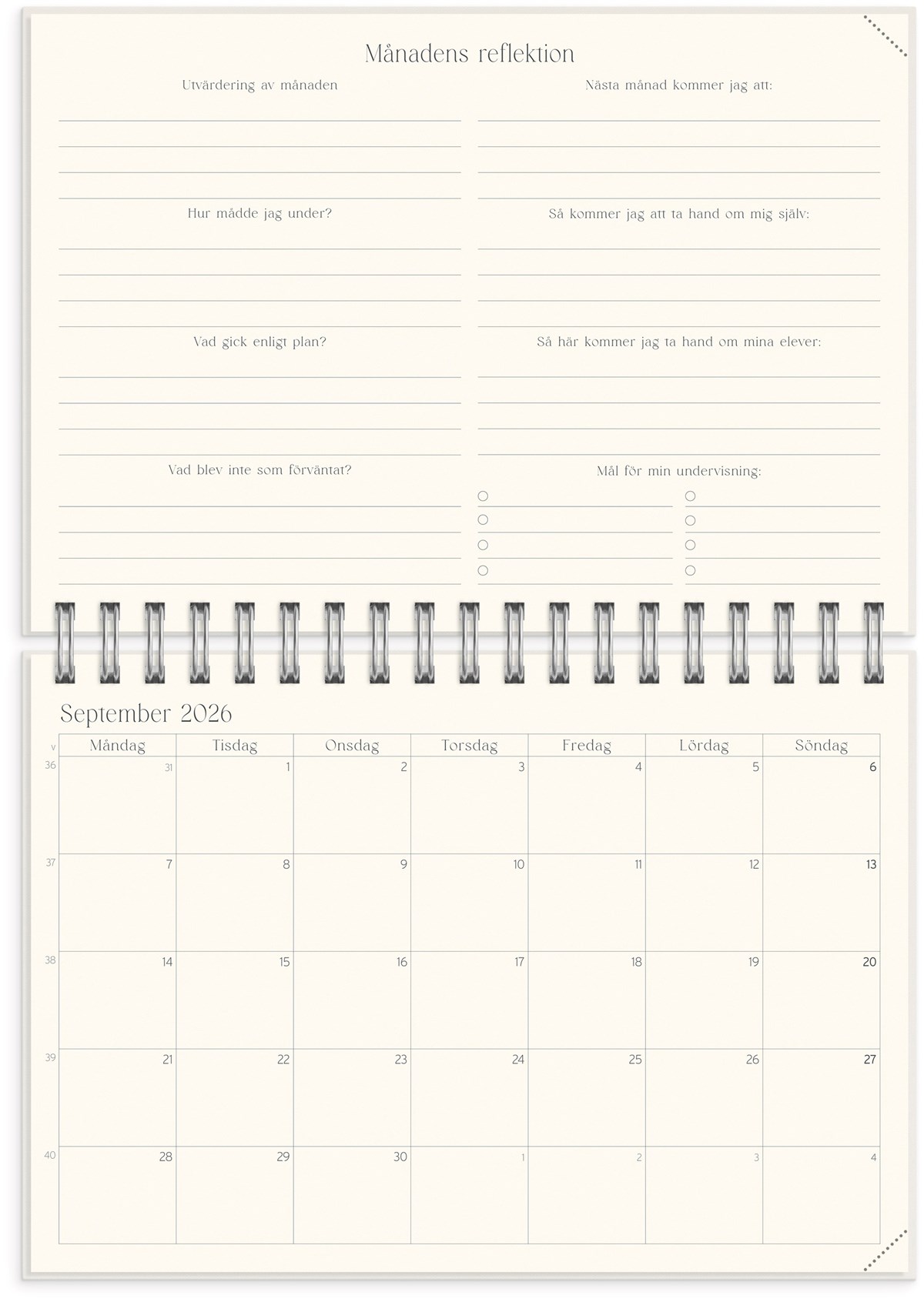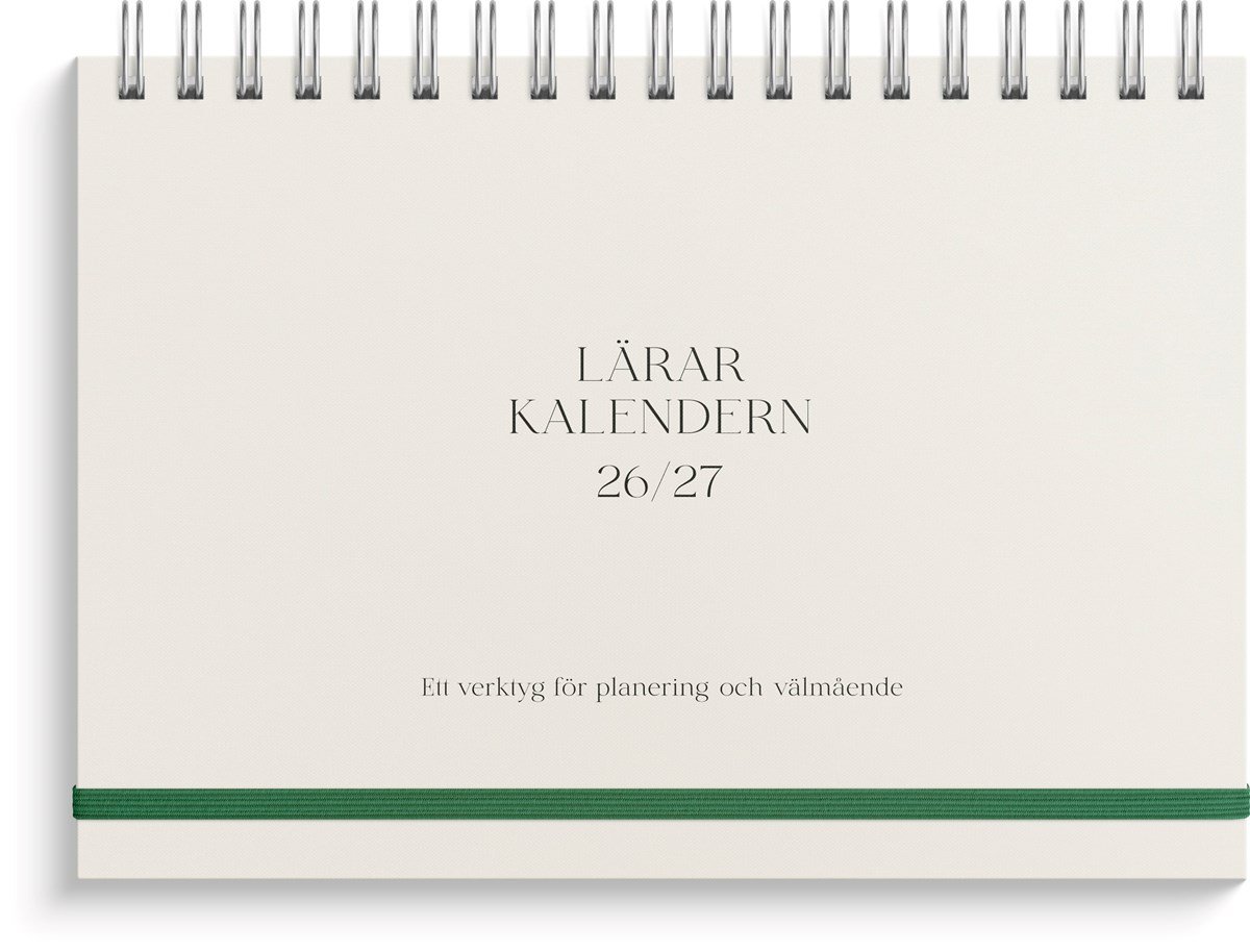 Format: B5 (176x250 mm). Mått: 195 x 20 x 254 mm. Layout: Vecka/uppslag. Stående. Timindelning 8-17. Kalendarium: 2026-06-08 - 2027-07-25. Omslag: Kartong med struktur. Spiralbunden. Detaljer: Gummiband. Plastficka. Innehåll: Flaggdagar, helgdagar/aftnar, månfaser, namnsdagar, temadagar/händelser, årsplan/årsplaner, anteckningssidor, reflektioner, schema, elevfrånvaro, elevförteckning. Antal sidor: 208. Miljöinformation: FSC®.