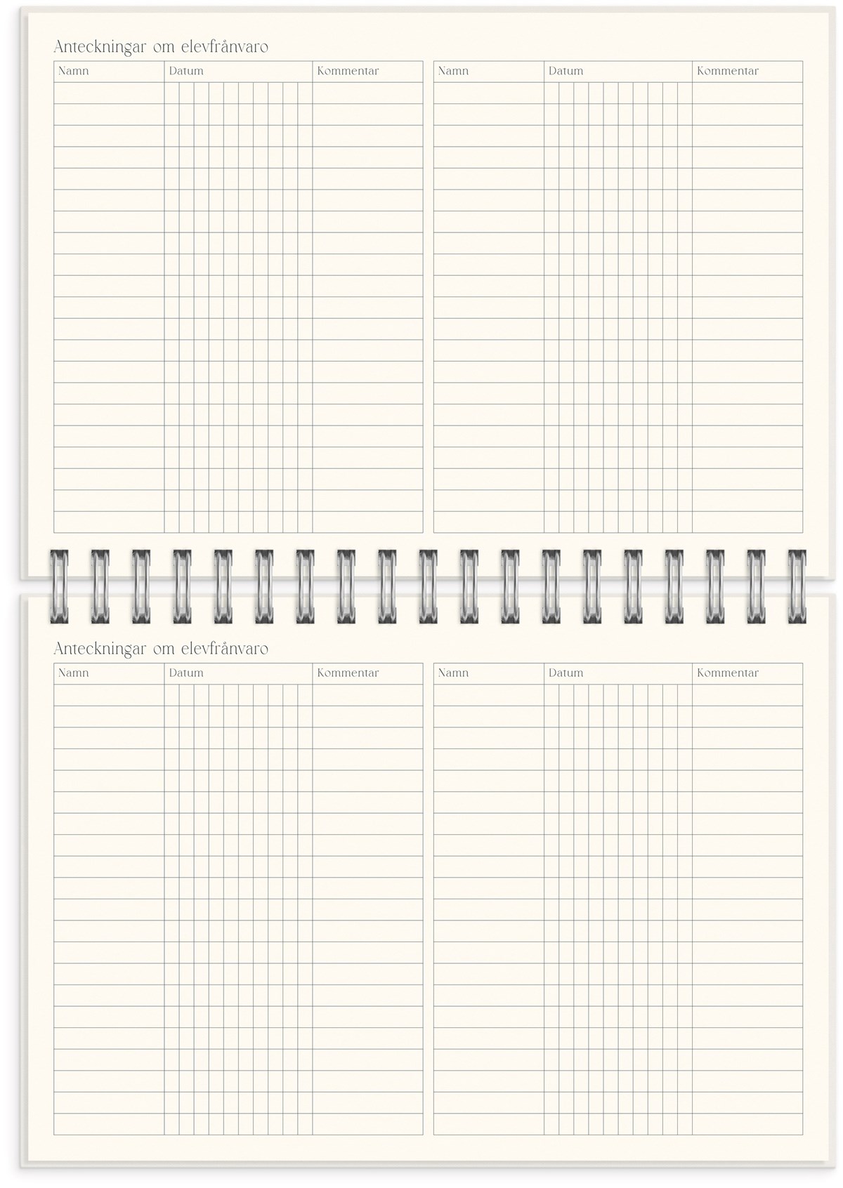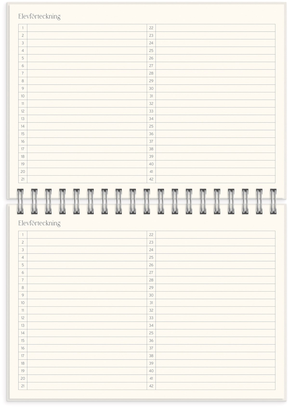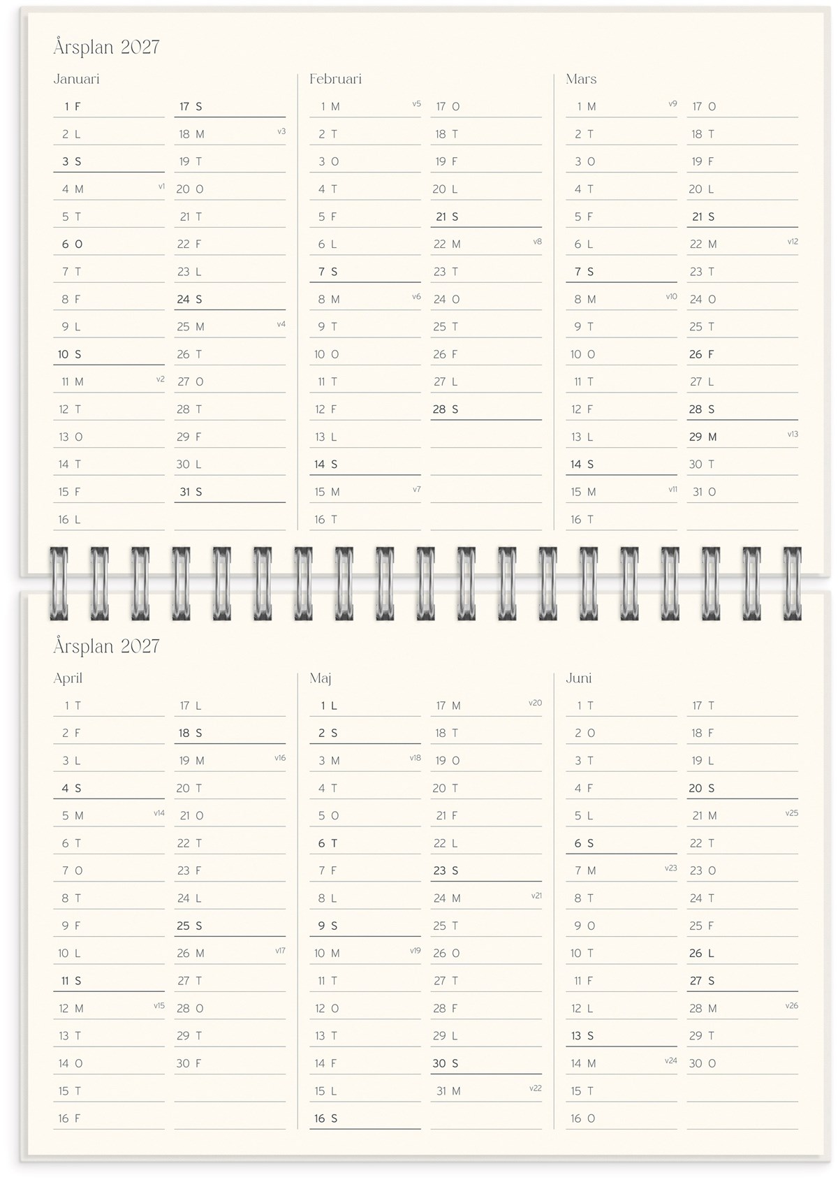 Format: B5 (176x250 mm). Mått: 195 x 20 x 254 mm. Layout: Vecka/uppslag. Stående. Timindelning 8-17. Kalendarium: 2026-06-08 - 2027-07-25. Omslag: Kartong med struktur. Spiralbunden. Detaljer: Gummiband. Plastficka. Innehåll: Flaggdagar, helgdagar/aftnar, månfaser, namnsdagar, temadagar/händelser, årsplan/årsplaner, anteckningssidor, reflektioner, schema, elevfrånvaro, elevförteckning. Antal sidor: 208. Miljöinformation: FSC®.