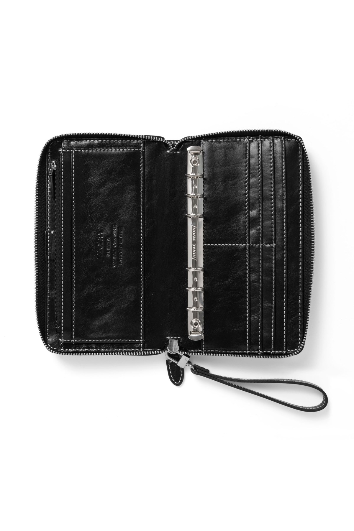 Malden systemkalender i ett delikat premiumläder. Rustik, men ändå mjuk och följsam med kraftig dekorsöm och slejf. Praktisk ficka med dragkedja på insidan. Inbyggd RFID-kortskydd för att skydda kredit- och betalkort, en avtagbar handledsrem och en avtagbar ringmekanism för att möjliggöra användning som handväska endast. För din dagliga planering och projektledning innehåller den också en dagbok (vecka per uppslag) tryckt på 80g lyxig krämfärgat, papper.