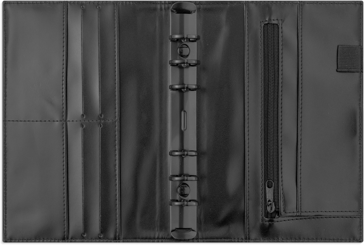 Systemkalender med grundsats. Grundsatsen innehåller hålad kalenderdel (4601) och blankettdel. Pärmen har ringmekanism (Ø 20 mm), se kreditkortsfickor, myntficka, fack för kvitton o dyl och pennhållare. Format pärm: 135x195 mm.