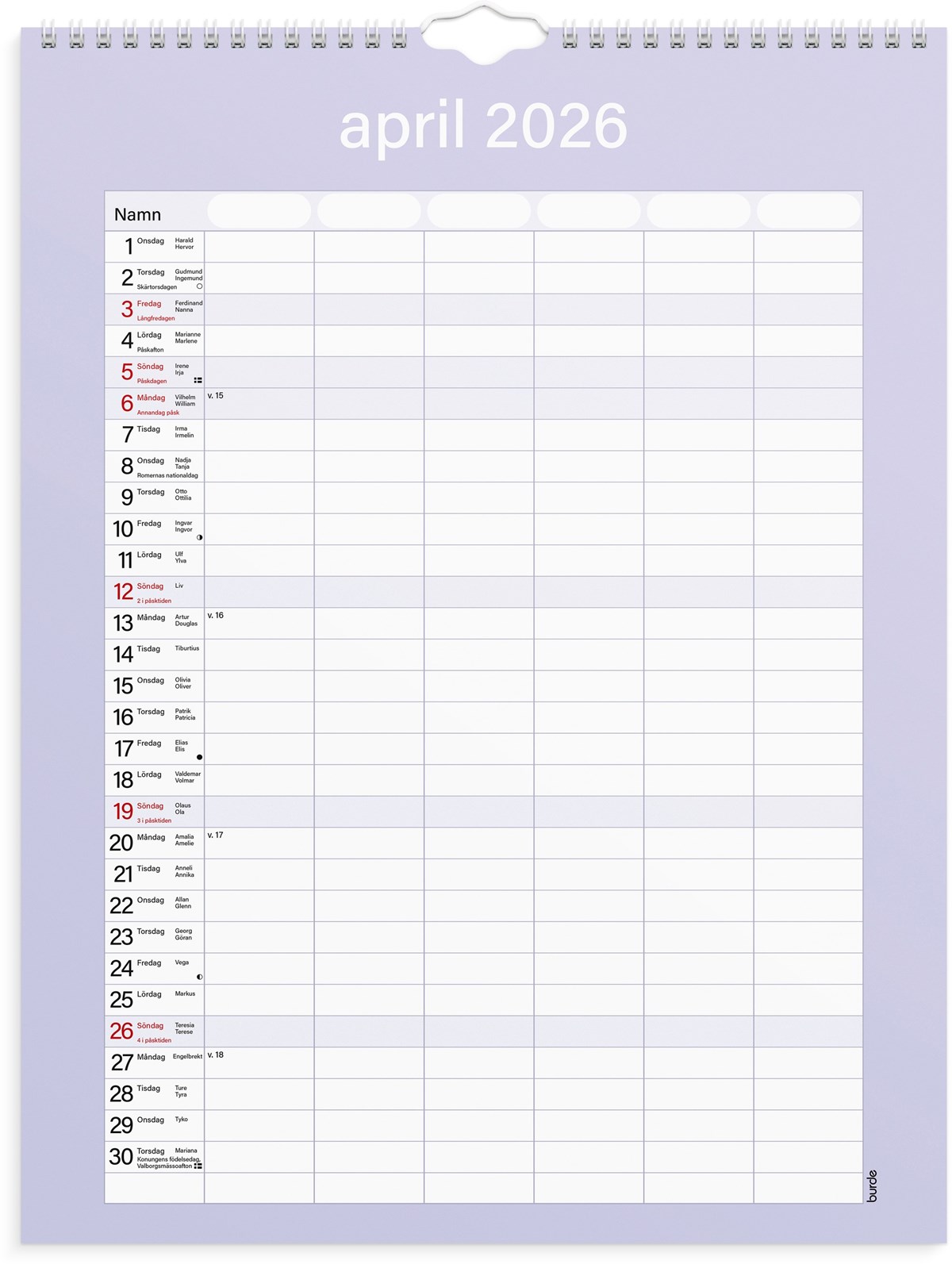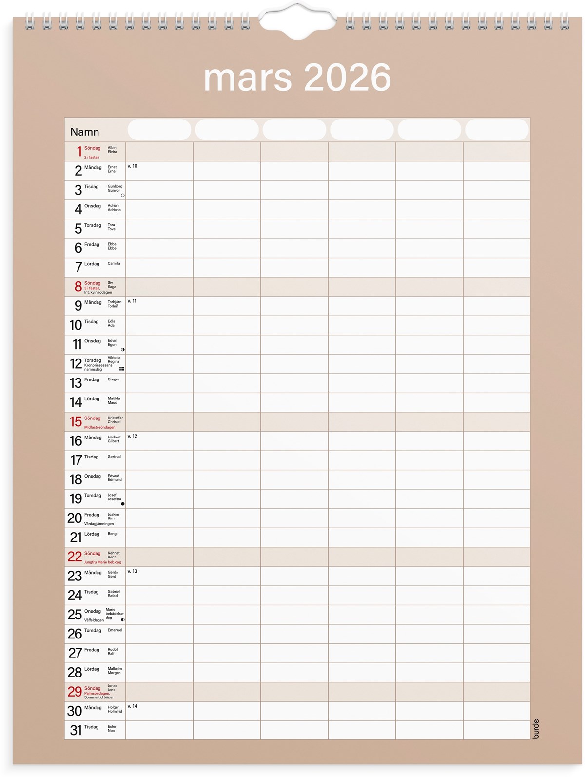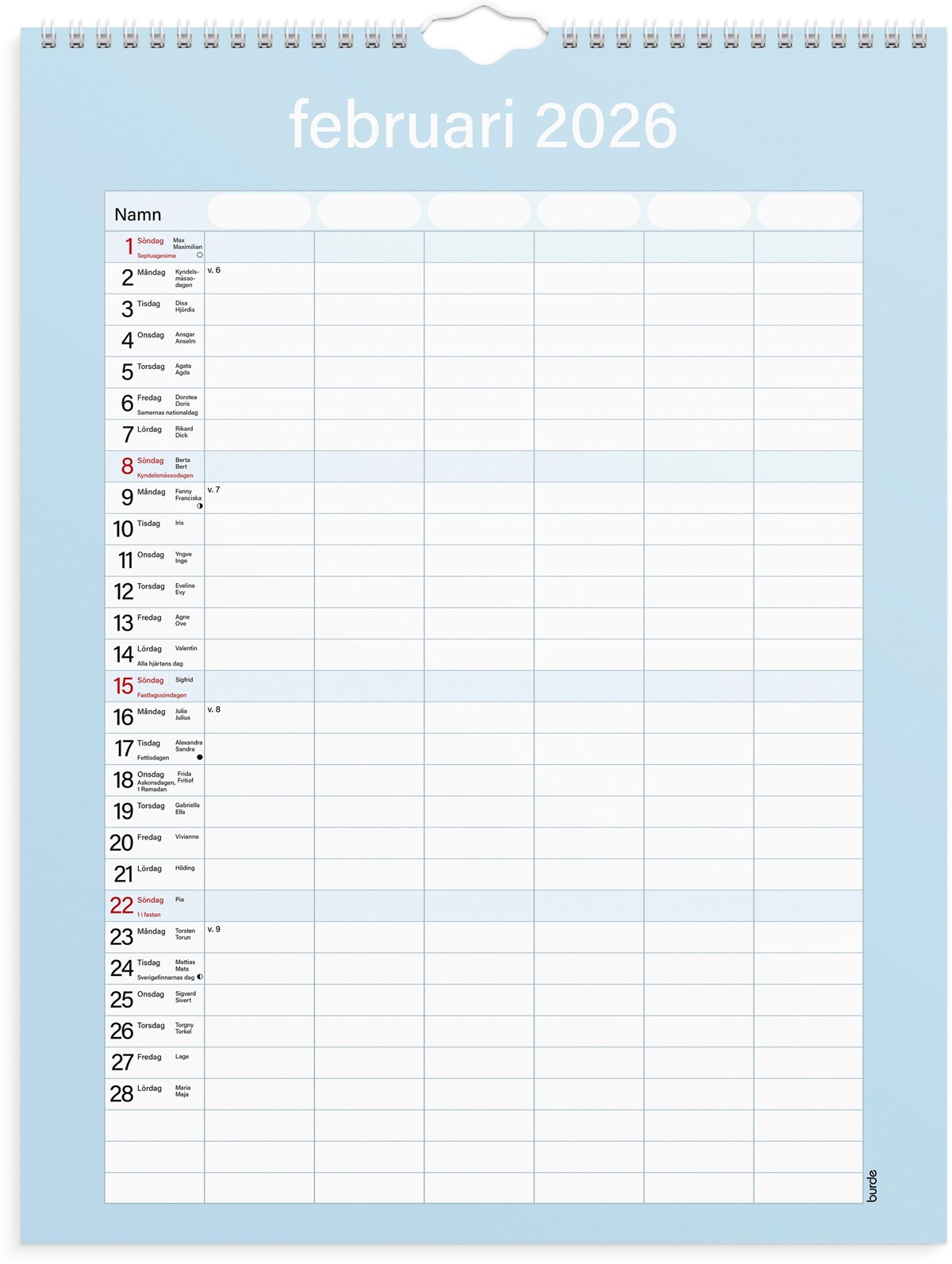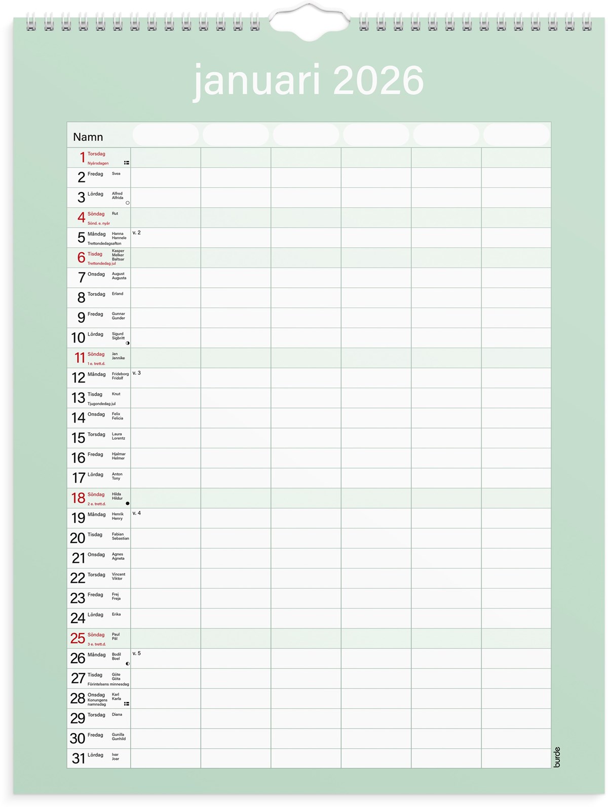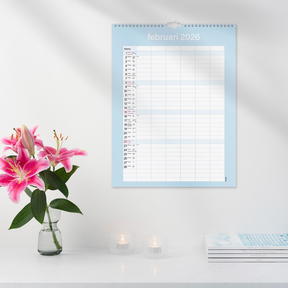 En neutral praktisk familjekalender att hänga på väggen. Kalendern har sex kolumner som passar den stora familjen eller för er som vill ha en möjlighet att planera det där lilla extra för att få ihop ert livspussel. Använd exempelvis de extra kolumnerna till att planera in måltider eller födelsedagar.