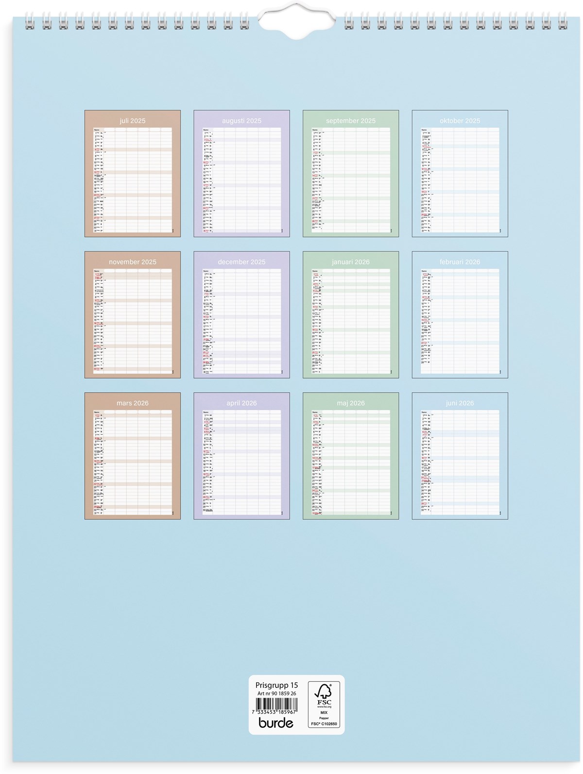 Format: 295x390 mm. Layout: Månad/blad. Kalendarium: 2025-07-01 - 2026-06-30. Spiralbunden. Innehåll: Sex kolumner. Antal sidor: 12. Miljöinformation: FSC®.