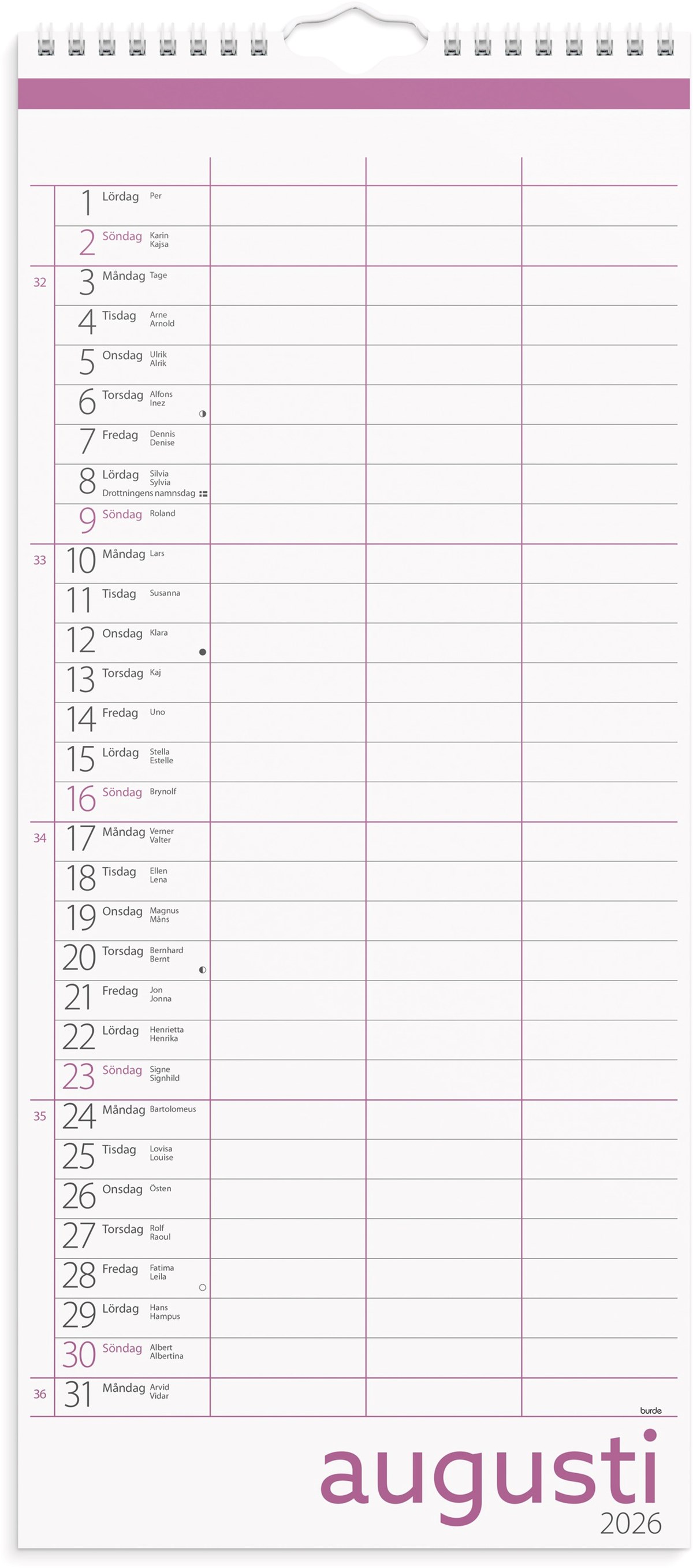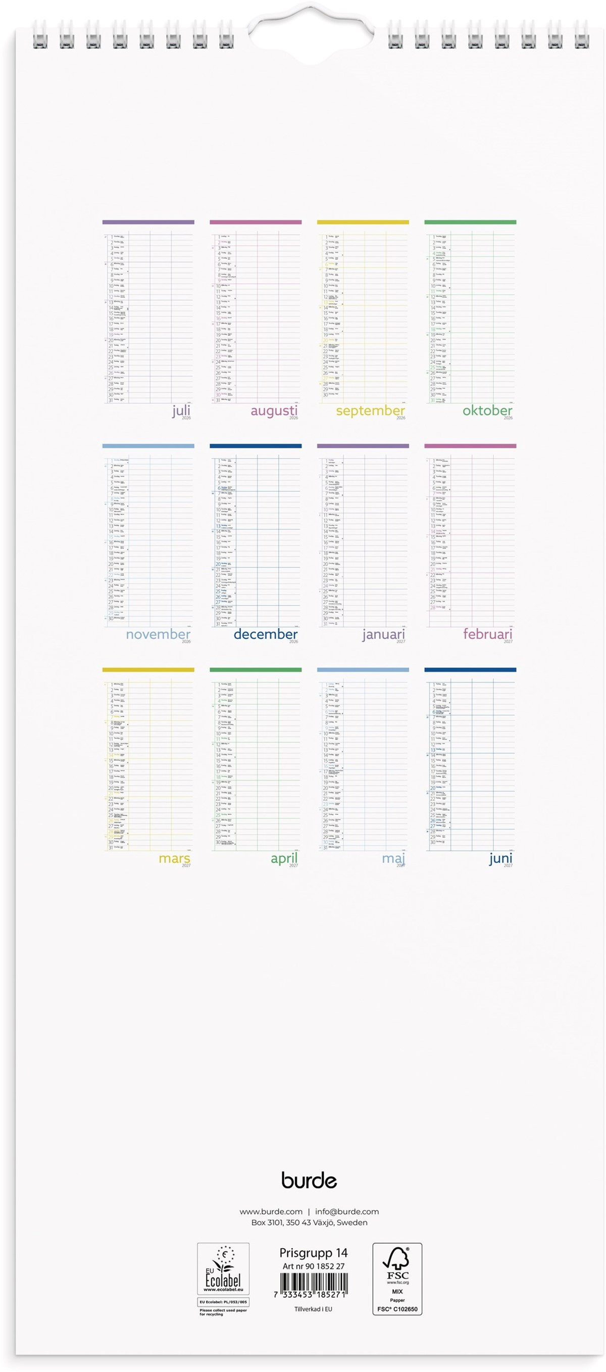 Mått: 434 x 189 x 3 mm. Layout: Månad/uppslag. Stående. Kalendarium: 2026-07-01 - 2027-06-30. Spiralbunden. Innehåll: Flaggdagar, helgdagar/aftnar, månfaser, namnsdagar, temadagar/händelser, 3 kolumner. Antal sidor: 12. Miljöinformation: FSC®. Ecolabel.