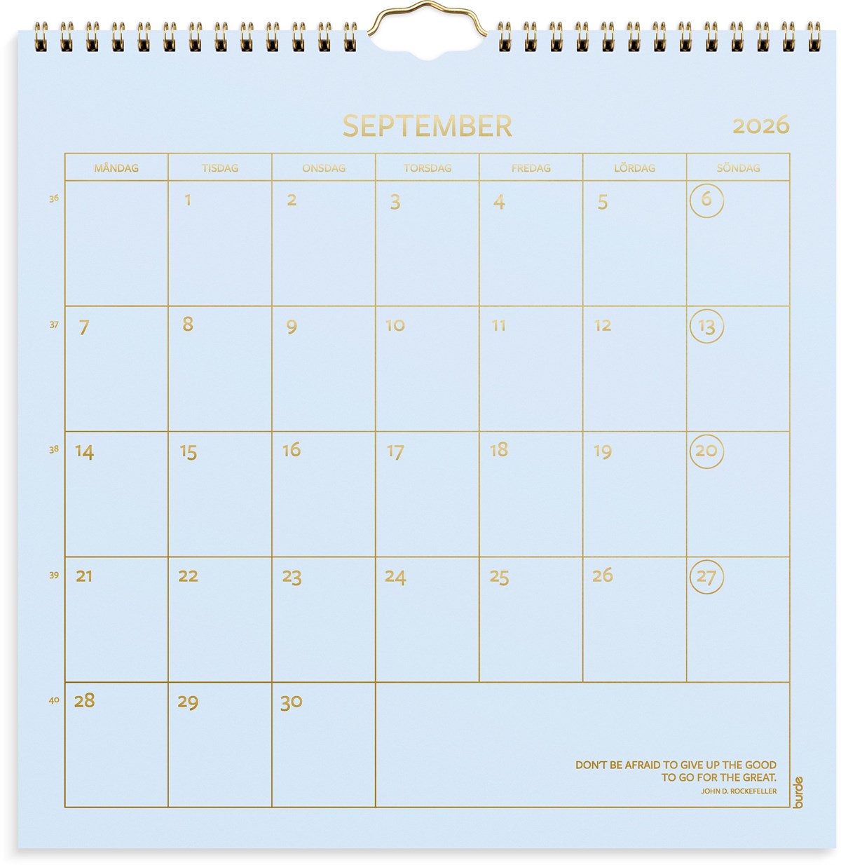 Väggkalendern är designad i trendiga pastellfärger med lyxig guldfoliering vilket gör den till en självklar mittpunkt i alla hem! Inspirerande citat förgyller varje månadsuppslag.