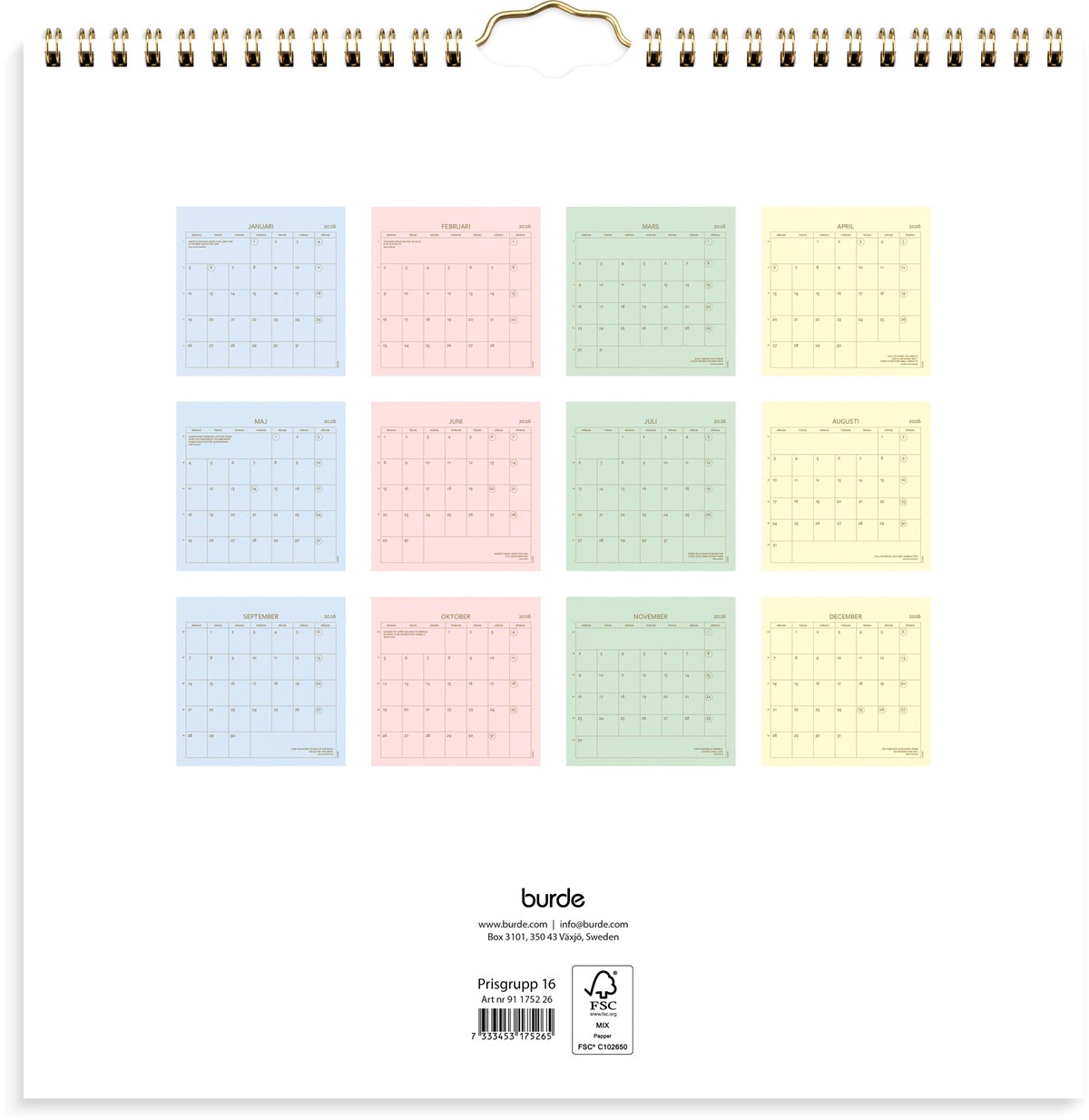 Format: 300x300 mm. Layout: Månad/blad. Kalendarium: 2026-01-01 - 2026-12-31. Spiralbunden. Innehåll: Helgdagar, Årsöversikt/årsöversikter. Antal sidor: 12. Miljöinformation: FSC®.