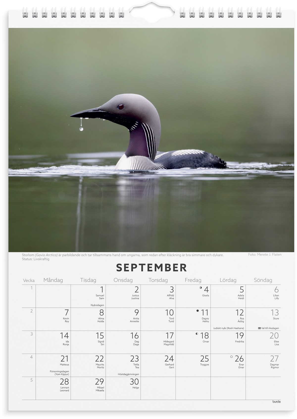 Format: A4. Layout: Månad/blad. Kalendarium: 2026-01-01 - 2026-12-31. Spiralbunden. Innehåll: Namnsdagar. Antal sidor: 12. Miljöinformation: FSC®.