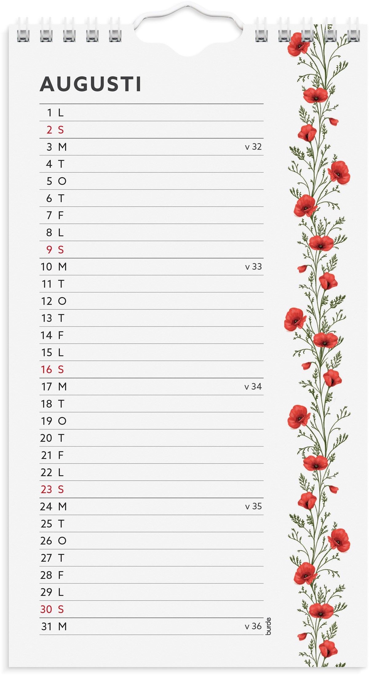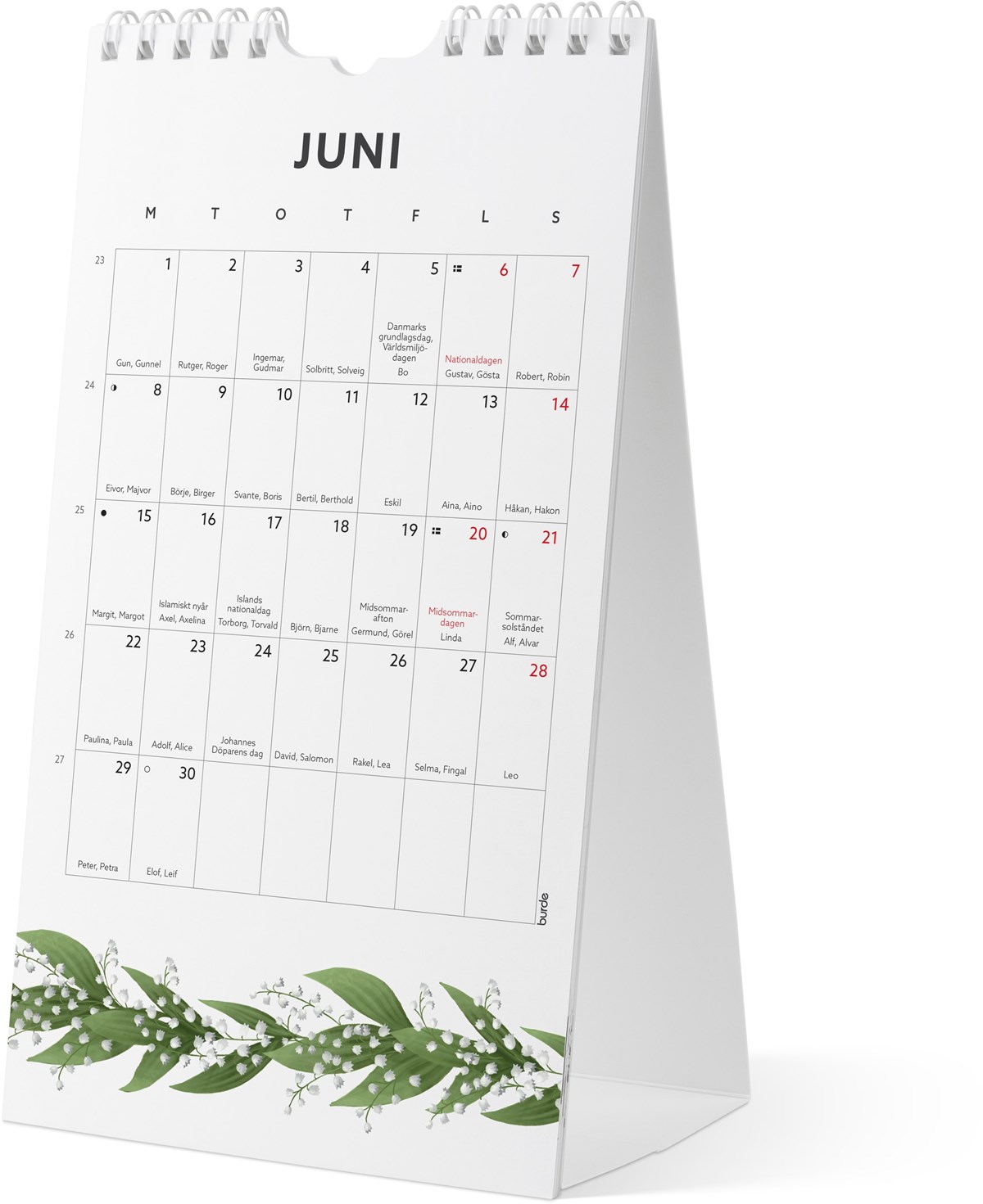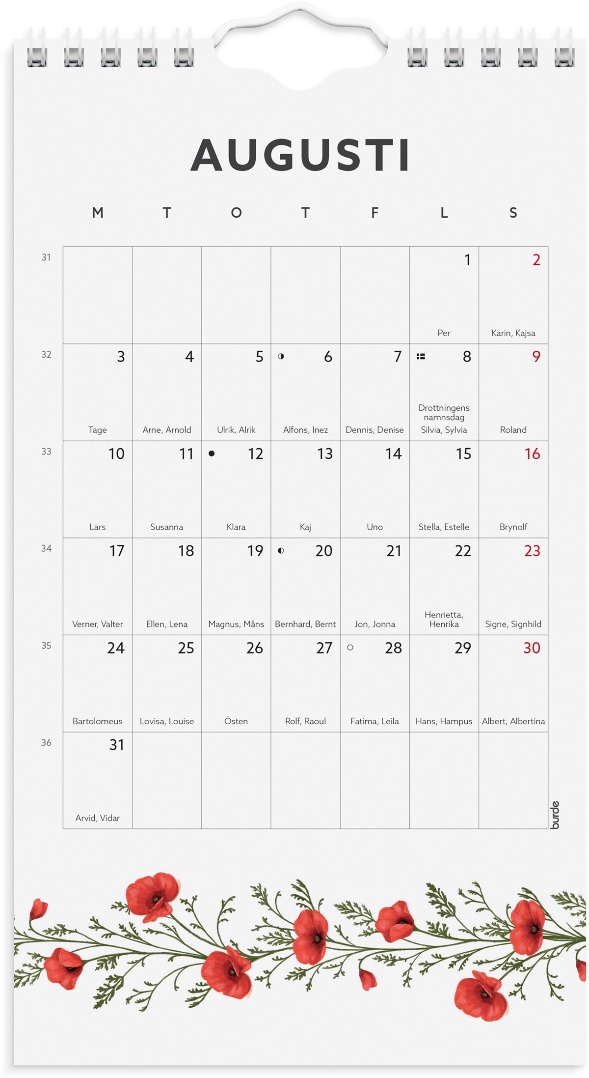 Liten, lättplacerad väggkalender och bordskalender i ett! Häng den på väggen eller veckla ut kartongbakstycket och ställ den på skrivbordet. Kalendern har söta blomstermotiv. Två olika layouter syns samtidigt varje månad när den står på bordet, varav den ena layouten har mer anteckningsyta. Välj vilken layout du vill ha när du hänger den på väggen.