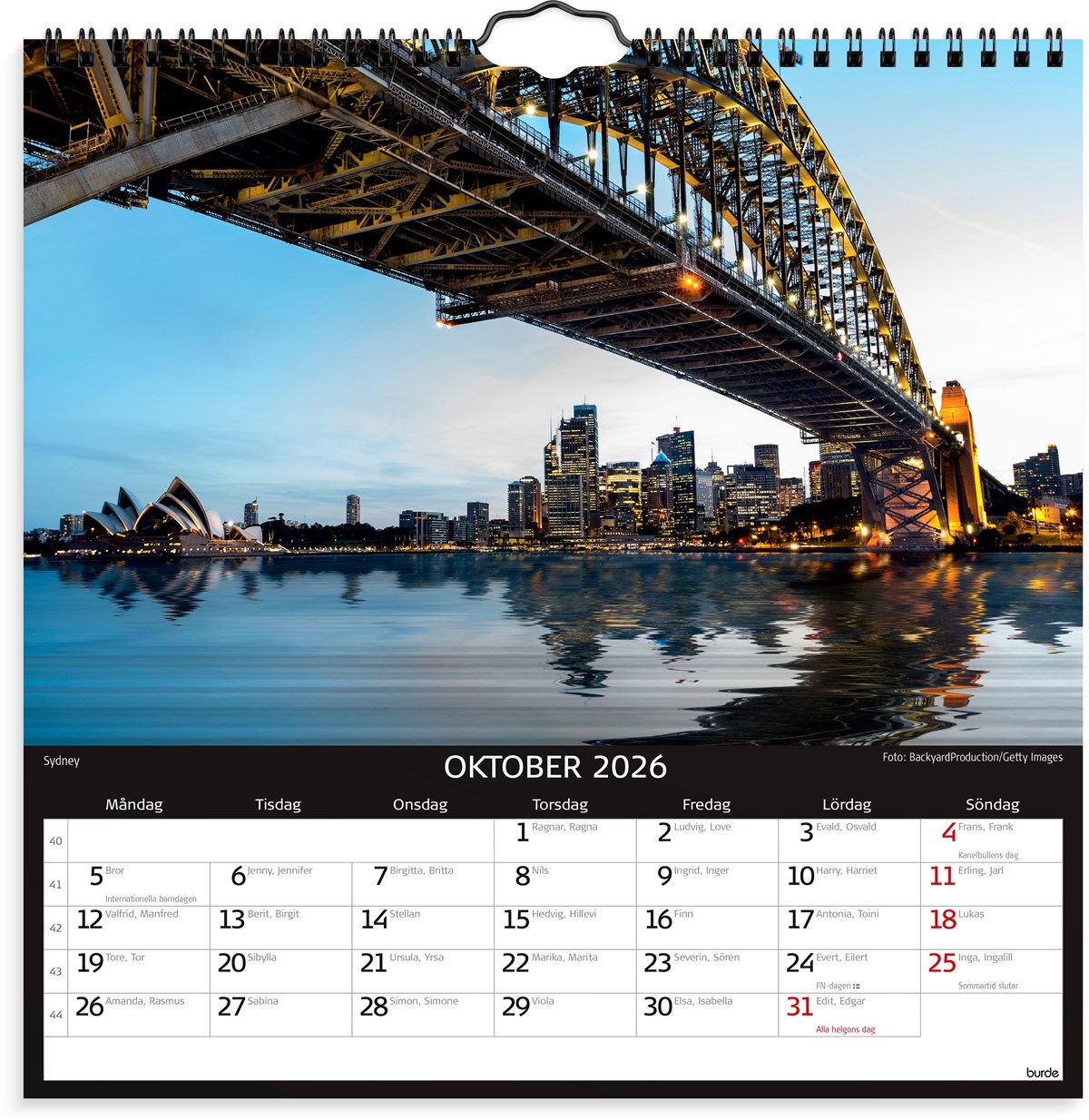 Format: 300x300 mm. Layout: Månad/blad. Kalendarium: 2026-01-01 - 2026-12-31. Spiralbunden. Innehåll: Flaggdagar, Helgdagar/aftnar, Namnsdagar, Temadagar/händelser. Antal sidor: 12. Miljöinformation: FSC®.
