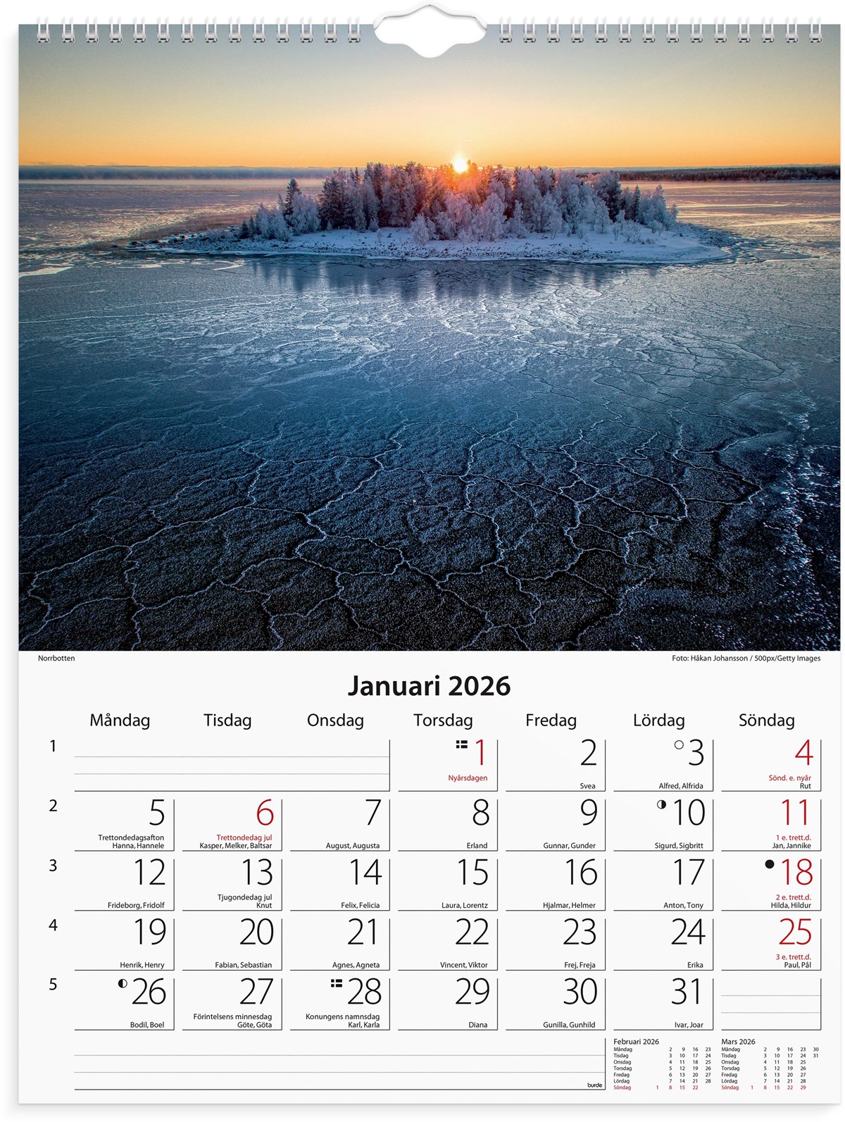 Format: 295x390 mm. Layout: Månad/blad. Kalendarium: 2026-01-01 - 2026-12-31. Spiralbunden. Innehåll: Kyrkliga helgdagar, Flaggdagar, Helgdagar/aftnar, Månfaser, Namnsdagar, Temadagar/händelser. Antal sidor: 12. Miljöinformation: FSC®.