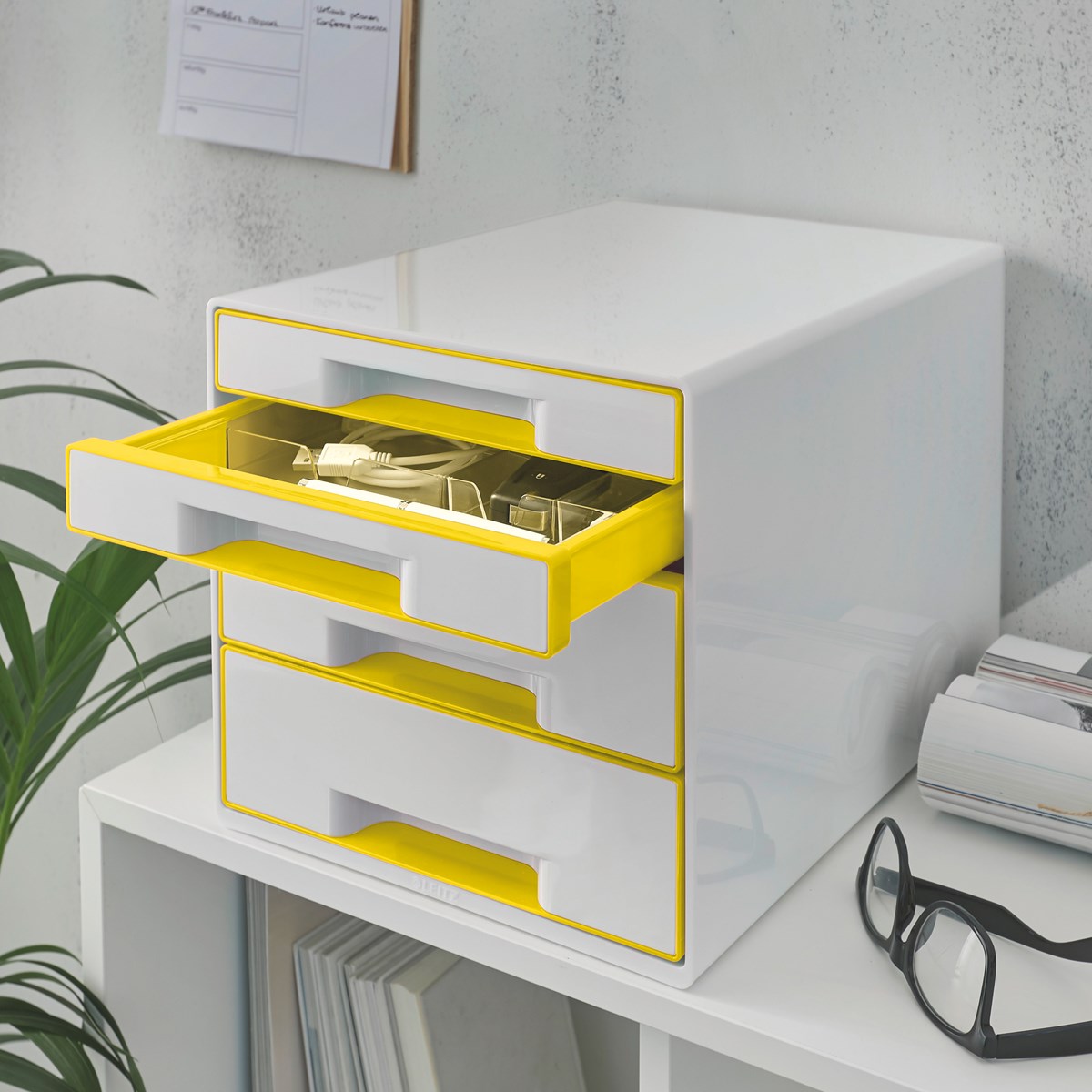Boxar i hög kvalitet med högblank yta. Lådor med plats för dokument, mappar, tidskrifter, kablar, block m.m. Ett transparent sorteringsfack för förvaring av små objekt såsom pennor, gem m.m. medföljer. Mått: B287 x H270 x D363 mm.