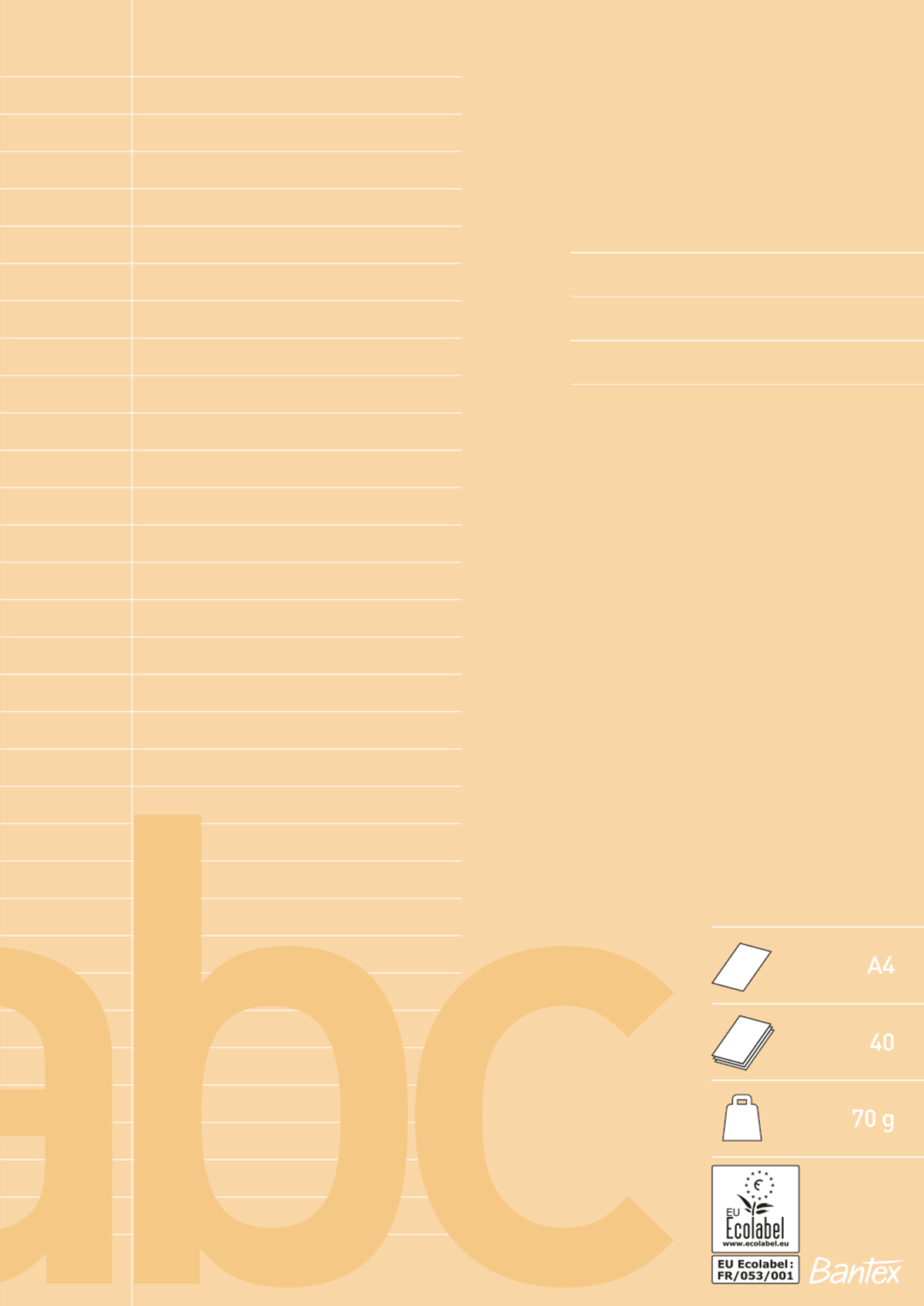 Skolhäfte i 70 g papper. A4-format. Linjeringsdetaljer: 8,5 mm / 32 linjer. 40 blad.