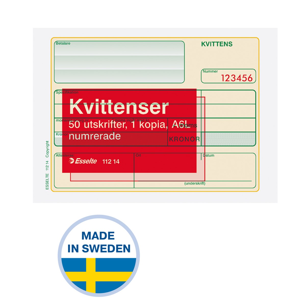 Svensktillverkade kvittensblanketter i format A5L. Tillverkade i ISO-certifierad fabrik i skånska Göingebygden. Råvaror från Sverige och Tyskland. Numrerade kvittenser med en (1) kopia. Självkopierande papper. 2 x 50 blad.