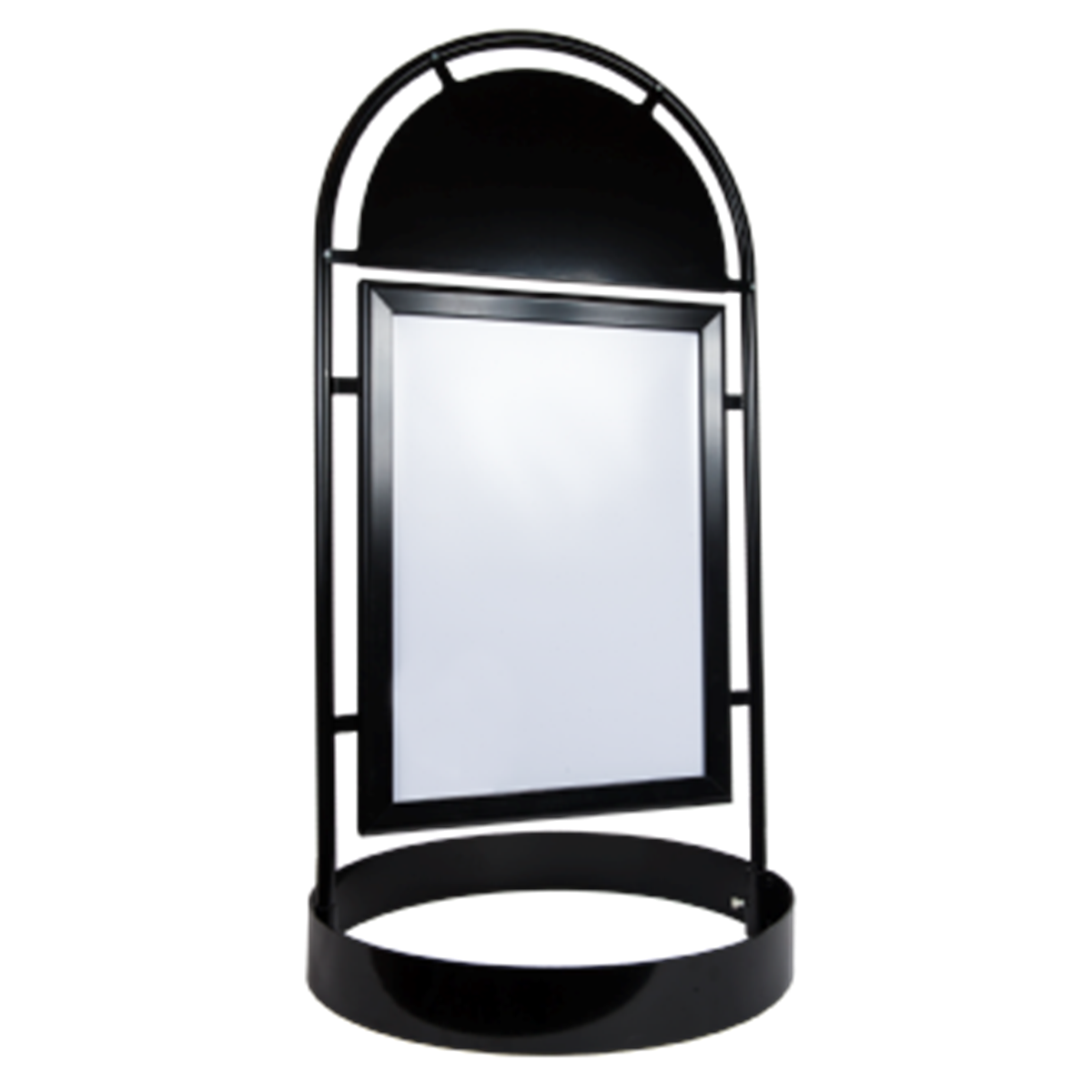 Ett snyggt och stabilt gatuställ som passar både inomhus och utomhus. Rund fot och tillverkad i 25 mm svartfärgat stålrör som är fosfat och polyesterlackerat. Format: 70x100 cm. Fotens diameter är 88 cm. Plats för logga. Levereras med frontplast.