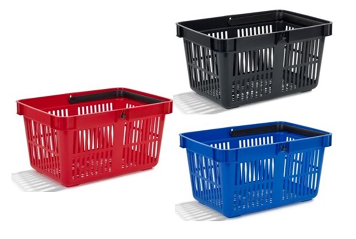 Kundkorg i traditionell modell med ett handtag i svart plast. Rymmer 27L.