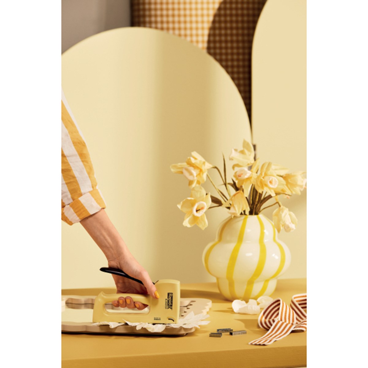 Upptäck vår fantastiska häftpistol R13 - det ultimata verktyget för att släppa loss kreativiteten. Tillverkad av 90% återvunnen plast, hämtad från gamla kylskåp, är detta verktyg både ett praktiskt och hållbart val. Att häftpistolen är producerad i vår hemstad Hestra är något vi är stolta över. Att ha produktion i Sverige ger inte bara högkvalitativa produkter utan bidrar också till en känsla av lokal stolthet och ansvar. Under våren och sommaren blomstrar Sverige, våra fält och ängar täcks av blommor och det är därfrån vi fann inspirationen till den vackra gula färgen. I linje med de senaste trenderna inom heminredning blir denna häftapparat ett elegant och funktionellt tillägg till din verktygslåda. Häftpistolen är noggrant designad och anpassad efter dina behov. Lätt, enkel att hantera och idealisk för möbelklädsel, dekorativt arbete med olika textilmaterial och fastsättning av tunnare material, affischer och läder.